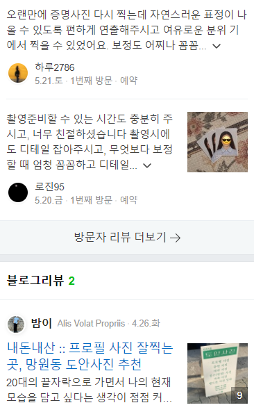 -예전에 중랑구 체험 점포로 오픈했을 때 무료 촬영 이벤트 보고 방문했었는데, 이번에 정식 오픈하고 할인 이벤트 하는 거 보고서 방문함. 당시에는 흑백 촬영이었고 이번에는 컬러 촬영이라 어떨까 싶었는데 사장님이 흑백도 컬러도 촬영을 잘 하시는 분이라고 느꼈음.