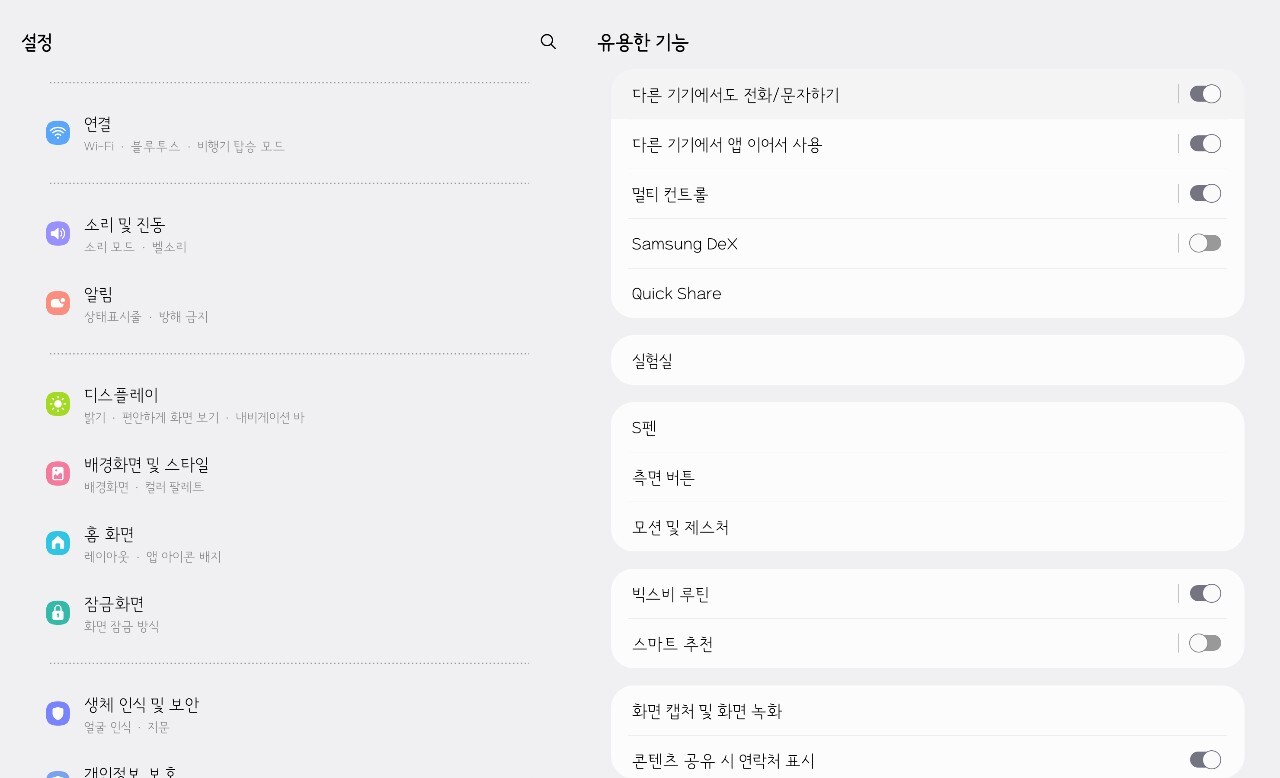 설정) 실험실- 유용한 기능> 전화, 문자, 클립보드 (윈도우 가능)/ 마우스 연동 무선 덱스는 스마트 티비면 가능(티비로 한컴/ 엑셀 가능)