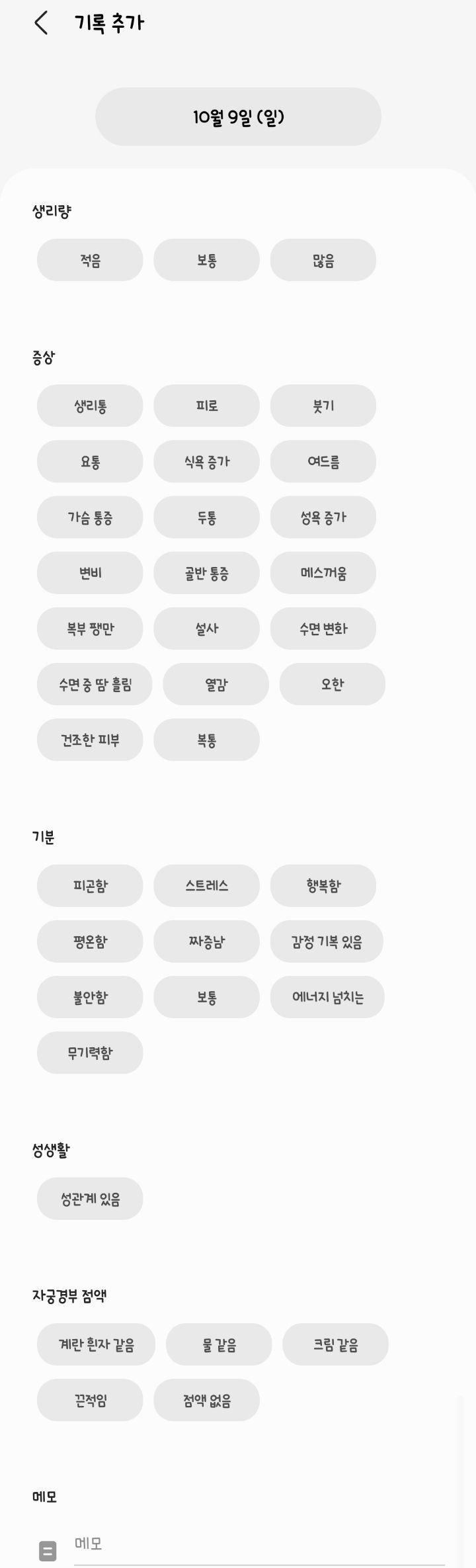 그리구 단순히 주기 기록뿐 아니라 이런 자세한 사항들까지 다양하게 선택할 수 있어서 내 몸을 더 알게되고 좋더라!! 진짜 나에겐 이 삼성헬스 앱이 효도템일정도... 갤럭시 쓰는 여시들이면 꼭 이 삼성헬스앱의 여성건강 탭을 적극 활용 해보는걸 추전해~! 규칙적이면 진짜 잘 맞출거고 불규칙하면 기록만 꾸준히 해주면 이 앱으로 광명을 찾을거야~~!! 많은 여시들에게 도움이 되었음 좋겠다!