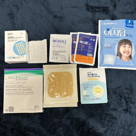 왼쪽 아래 듀오덤처럼 얇은 습윤밴드는 화상에 붙이면 안 돼! 저건 나 얼굴에 여드름 패치로 쓴 거야!! 헷갈리면 안 돼 ㅠㅠ