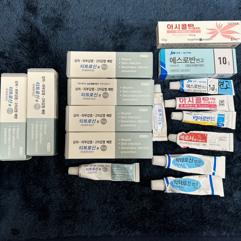 이미 포진이 났다! 수포가 터졌다 하면 티로트리신을 발라줘야 함. (2차 감염 예방) / 수포가 나거나 터진 다음에 아시클로버 바르면 효과 못 느낌. 티로트리신 성분 연고 바르면 효과 느껴짐👌