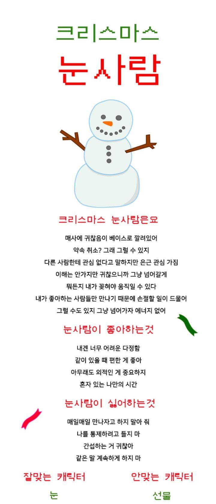 [[심테사주게임]]크리스마스 캐럭터 찾기 테스트(잘맞음) 작성자Golden 아워|작성시간22.12.12|조회수47,130 목록 댓글 370 글자크기 작게가 글자크기 크게가 출처 : 여성시대 (Golden 아워)https://christmasmbti.netlify.app/#.Y5XAfULSajA.kakaotalk크리스마스 성격 테스트나를 닮은 크리스마스 캐릭터는 무엇인지 MBTI 기반으로 찾아주는 사이트 입니다.christmasmbti.netlify.appIsfp인데 눈사람 완전나 그 잡채 다음검색 현재 게시글 추가 기능 열기 북마크 공유하기 신고 센터로 신고 댓글 댓글 370 댓글쓰기 답글쓰기 댓글 리스트 작성자21:21 | 작성시간 22.12.17 엣프제 양말 작성자술술잘풀리는여시 | 작성시간 22.12.18 istj 지팡이 작성자몬대몬데문디 | 작성시간 22.12.18 Isfp 트리 작성자핵건 | 작성시간 22.12.25 나도 isfp 눈사람 ㅋㅋㅋㅋㅋ 작성자Noganzi | 작성시간 23.01.03 isfj 지팡이 댓글 전체보기