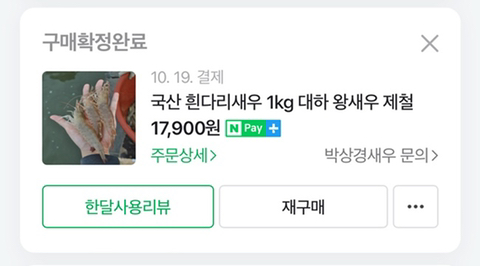이건 유일하게 상세샷이 있음ㅋㅋㅋㅋ 매년 돌아오는 대하철! 1인 가구지만 용감하게 시켜봄.. 근데 혼자서도 충분히 다 먹을 수 있고요?🙄 바로 다음 날 싱싱하게 도착해서 2개는 생으로 간장 찍어 먹고, 저만큼은 대하소금구이 해먹고, 몇개는 갈릭버터구이 해먹고 나머지는 껍질 까서 냉동 해놨다가 파스타 해먹었음ㅎ 비록 치우는 게 힘들긴 했지만 후회는 없다.. 맛있었으니까...