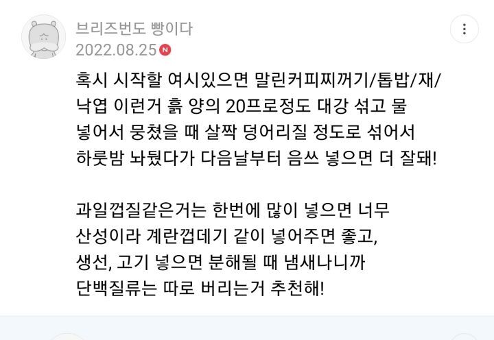 작성자9:46 작성시간 24.07.10 여시꺼 따라만들었는데 한 이삼일 조용하더니 곰팡이 피기 시작하더라구 넘 재밌고 편하다 ㅎㅎ 아침마다 흰곰팡이 보면 희열 느껴짐 커피박도 섞어주고 쌀뜨물 깜빡했는데 오늘 넣어봐야겠어