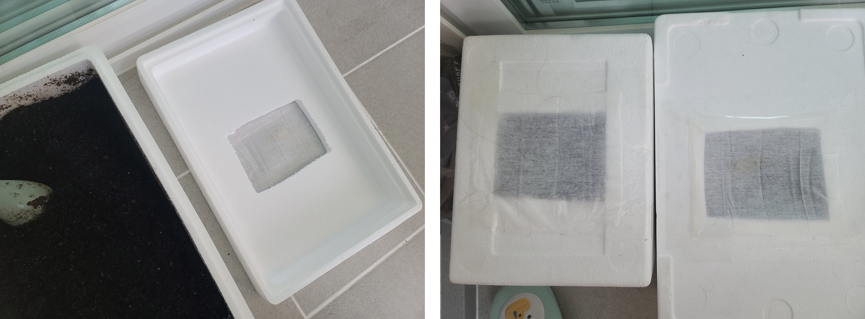 재료 : 스티로폼박스 2개, 칼, 구멍 막을만한 재료(양파망, 광목천 등), 테이프, 흙(배양토)
