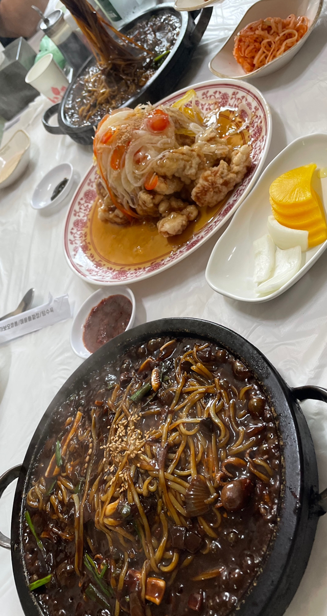 토종닭집에서 짜장면을..? 🤭 그치만 마싯는걸 어카나요? 네 명이서 짜장2 탕수육1 시켰고, 짜장면 양이 많진 않지만 *공기밥 무료 제공*이라 면 덜어내고 밥 볶아먹음 돌판이라 밥 다 먹을 때까지 따뜻하게 먹을 수 있어 좋았음.. 여기 열한시 오픈인데 11:10에 도착했을 때 우리가 마지막 테이블.. ㄷㄷ 점심 메뉴라서 이른 점심 먹는다 생각하고 가는 게 좋을 듯