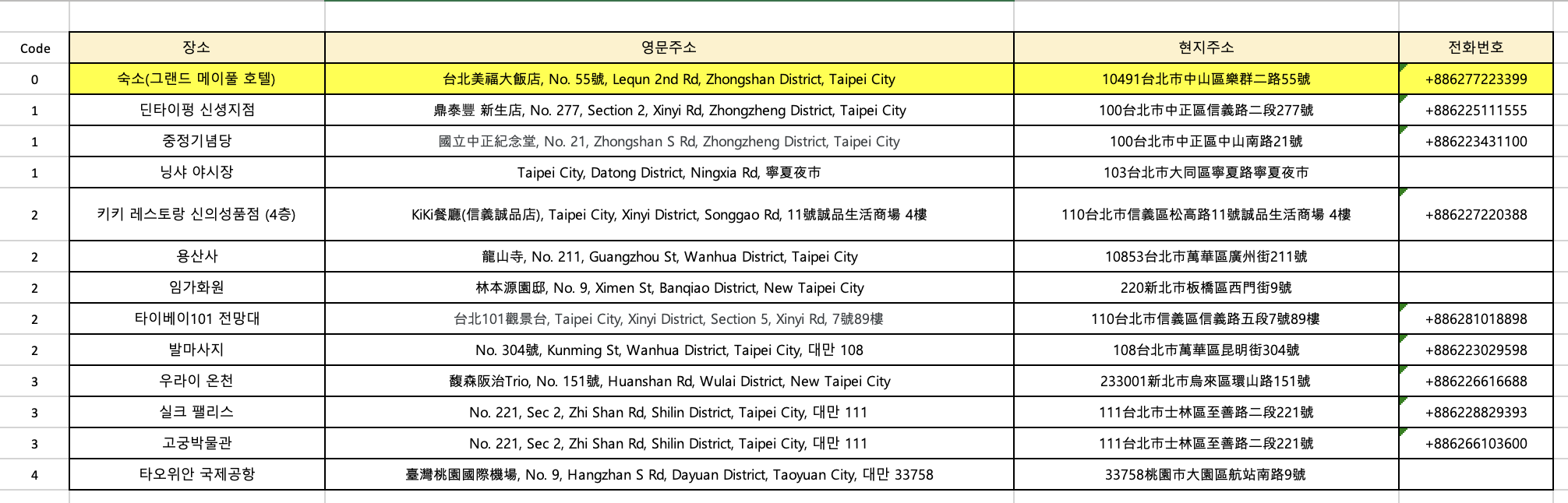 일정이 미리 나와있었기 때문에 나머지 관광지, 식당 등 주소는