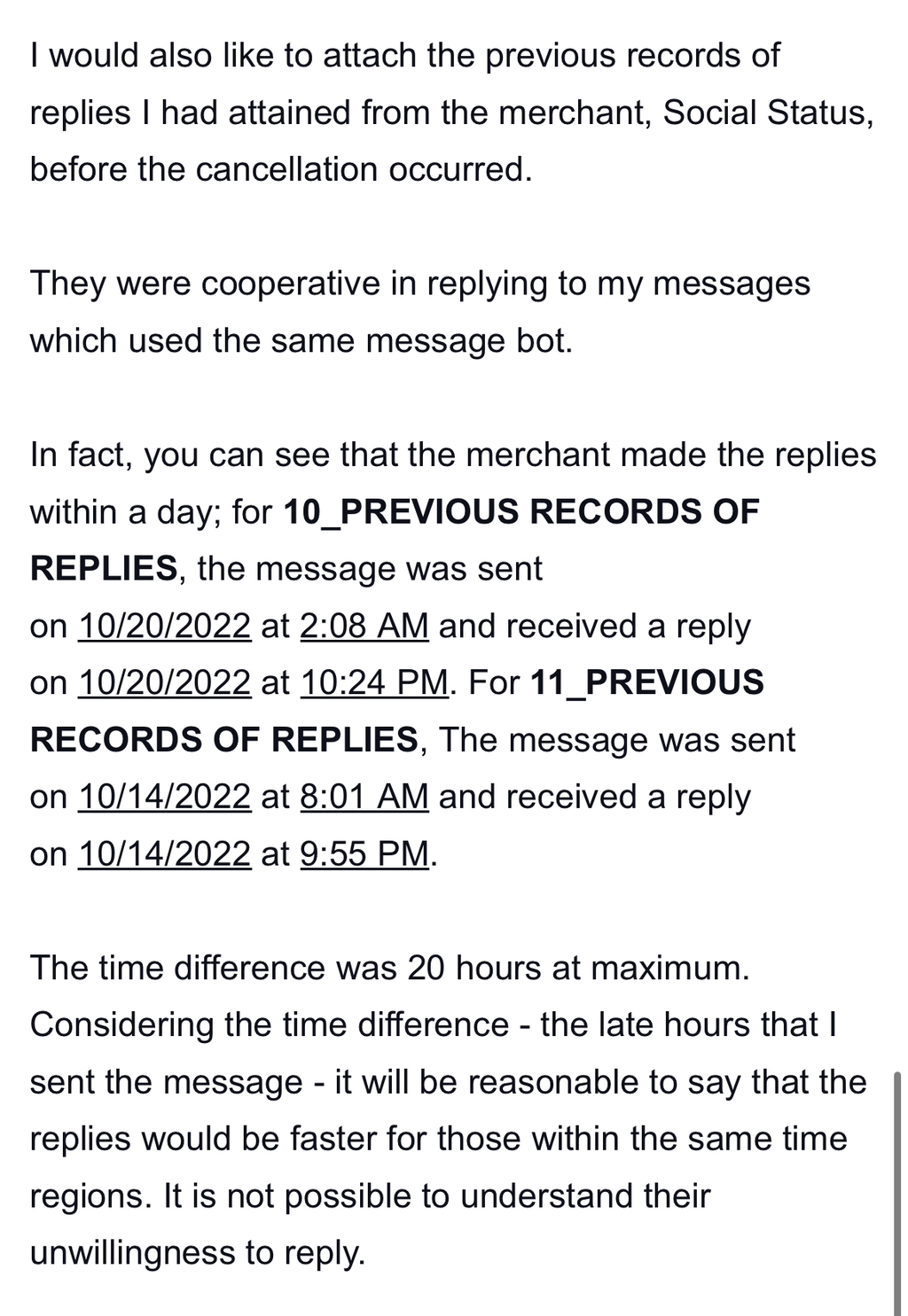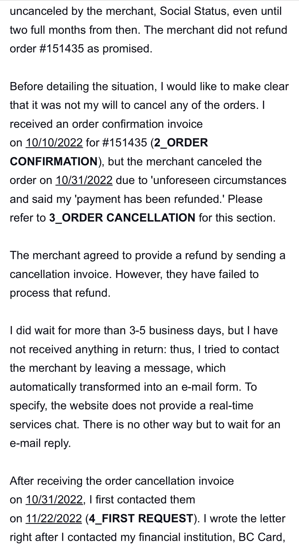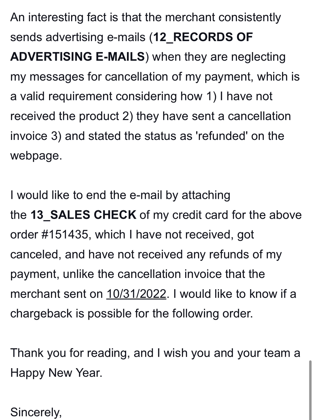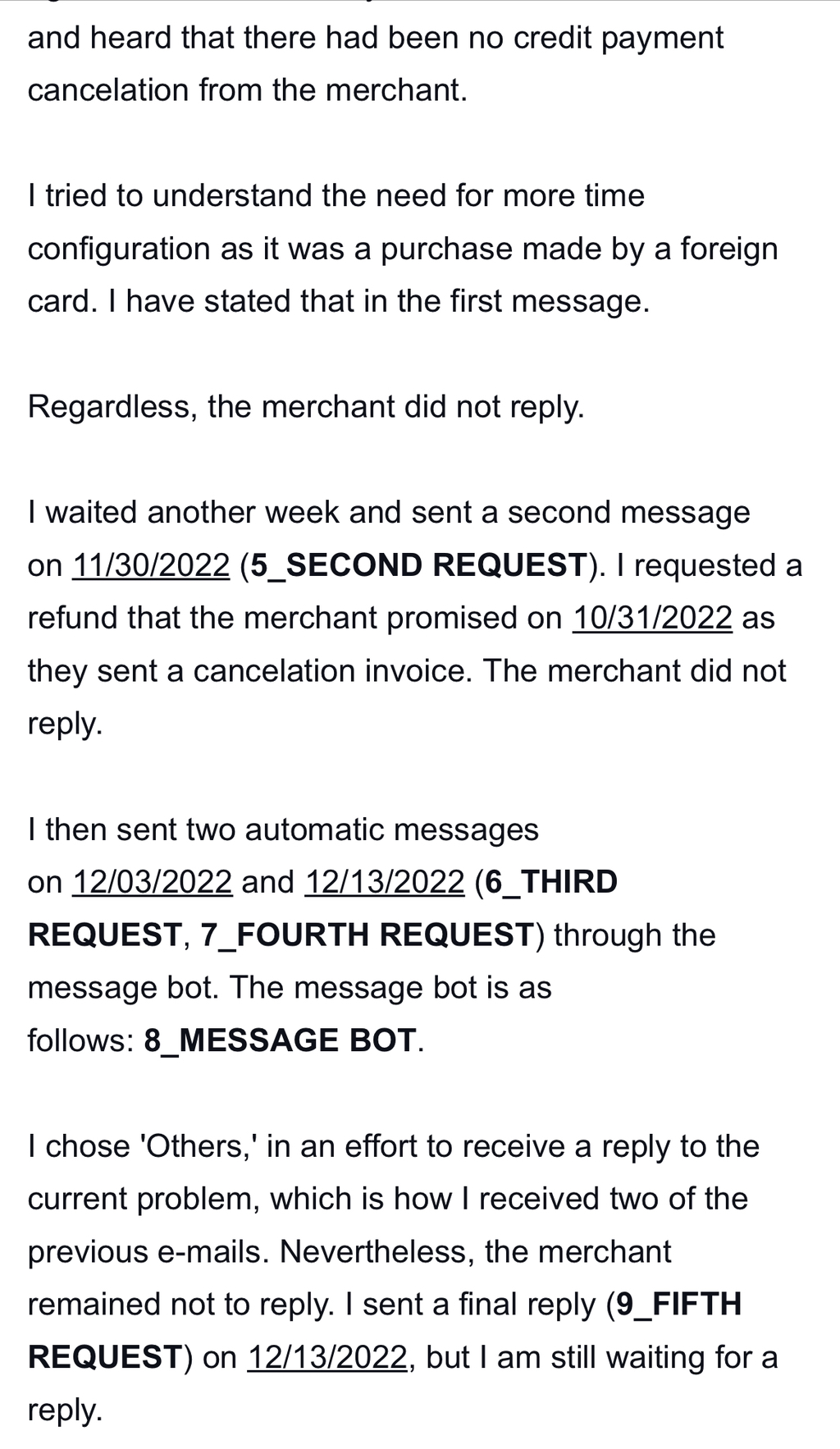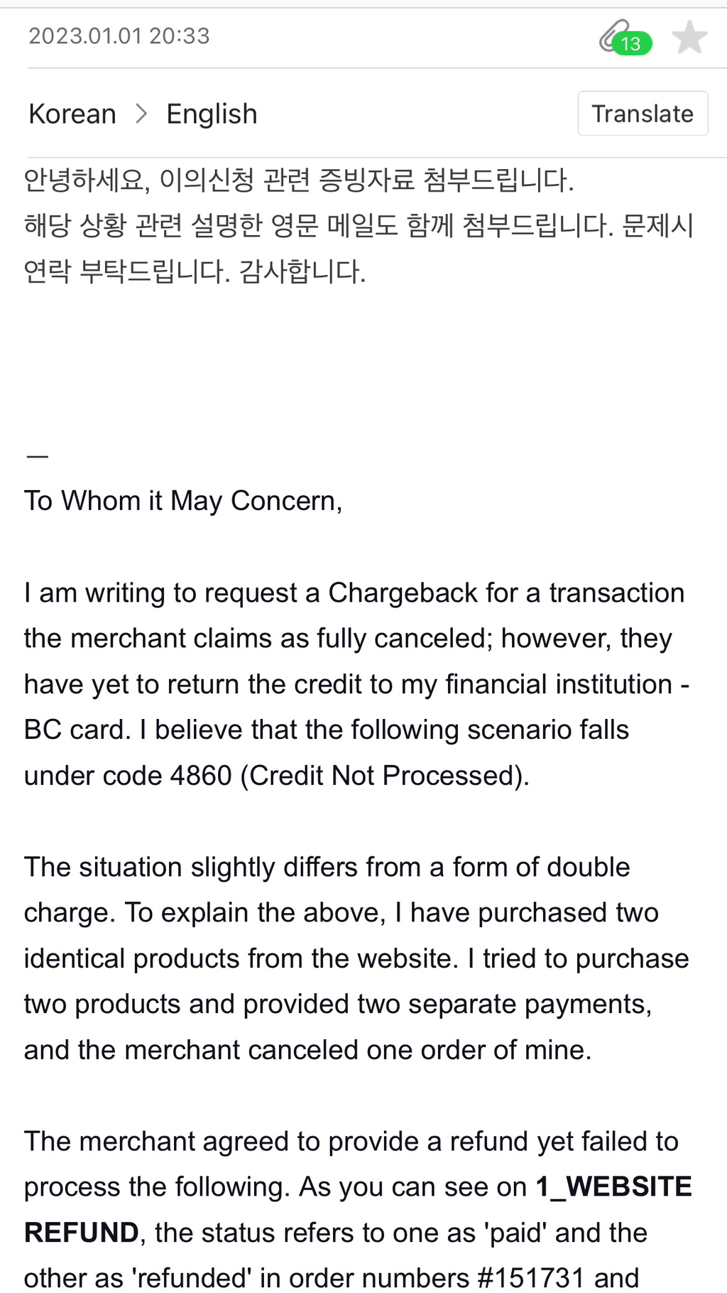 "상품을 환불해준다고 명시했으며 환불 인보이스를 보냈지만, 정작 취소 전표를 보내지 않고 연락을 계속 무시함” 이었어!