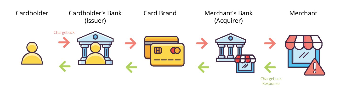 나(카드 주인) - 카드 주인의 은행(발행인) - 카드 브랜드(비자 또는 마스터카드) - 수취인은행 - 가맹점(판매자)