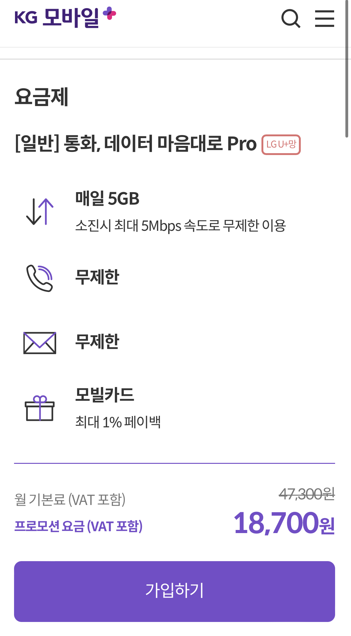 월 18700원 7개월까지 이후에는 47300원이라