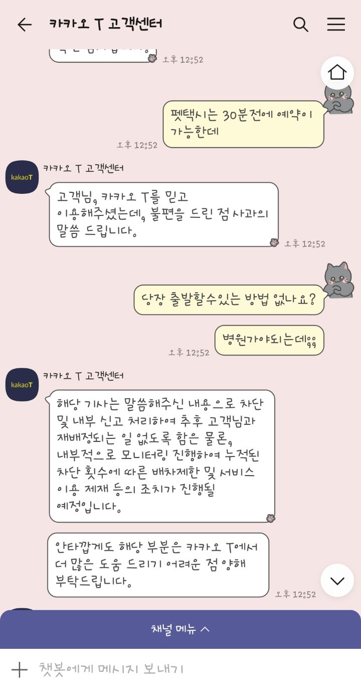 카카오T에 문의했더니 사과랑 말씀은 정말 좋게 해주셨지만 제대로 된 대책은 없는것같아.