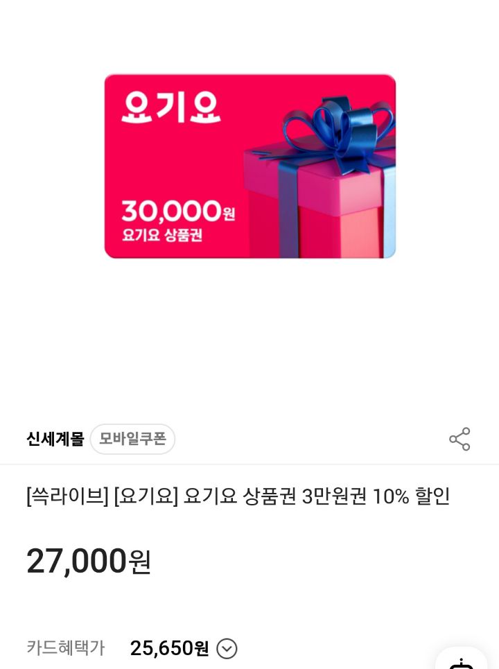 1.요기요 상품권 3만원권 10% 할인 27,000원
