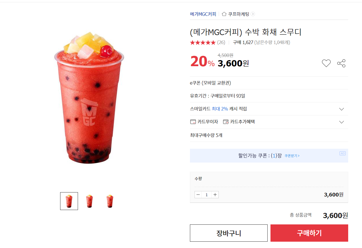 [[쿠폰세일정보]](옥션) 메가커피 수박화채스무디 4500원 -> 3600원 (20%할인) ❌️끝❌️ 작성자YESUNG|작성시간23.05.09|조회수3,213 목록 댓글 19 글자크기 작게가 글자크기 크게가 출처 : 여성시대 YESUNGhttp://auction.kr/iDGcaQL(메가MGC커피) 수박 화채 스무디 - ...3,600원itempage3.auction.co.kr 1인 최대구매수량 5개고유효기간은 구매일로부터 93일이래!유효기간 연장불가!!!!! 다음검색 현재 게시글 추가 기능 열기 북마크 공유하기 신고 센터로 신고 댓글 댓글 19 댓글쓰기 답글쓰기 댓글 리스트 답댓글 작성자한국의일론머스크 | 작성시간 23.05.09 잭다니엘 허니 와 오십그램..ㄷㄷㄷ 고마워 작성자으앙걀걀걀ㄴ | 작성시간 23.05.09 이거 수박 가는건가?? 작성자반짝이쫄따구 | 작성시간 23.05.09 왜안들어가지지!!!! 작성자진라면(순한맛) | 작성시간 23.05.09 사지마 수박 간거 아니고 존나 맛없어.펄도 안익어서 나 먹다가 다남기고 돈날림 작성자신한 싫어. | 작성시간 23.05.09 품절 ㅜ 댓글 전체보기