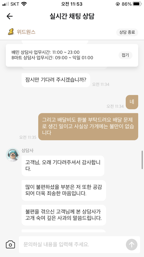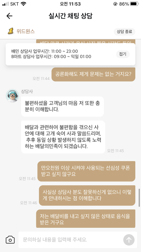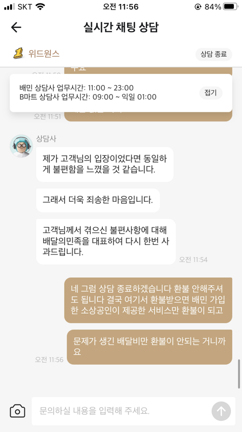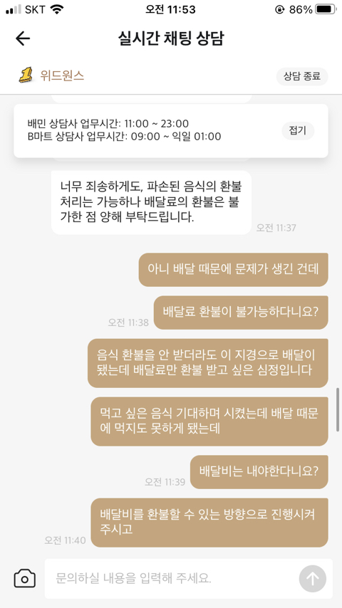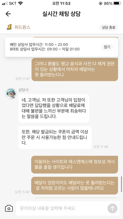 아주 명확하게 배달료만 환불이 안된다고 말하고 있어. 내가 계속해서 문제가 된 부분이 배달이니 배달료를 환불해달라고 하자 쿠폰으로 유도를 해. 그래도 완강히 환불을 요구하니까 그건 배민 정책이라 불가능하다고 하지.