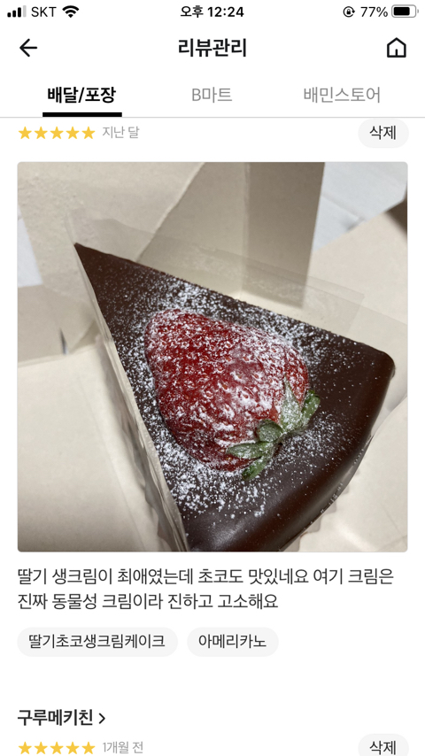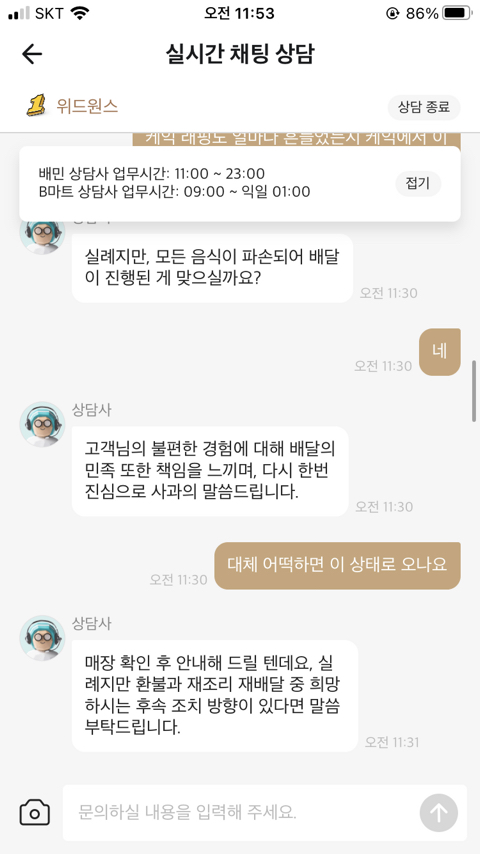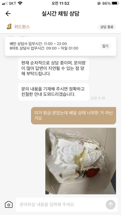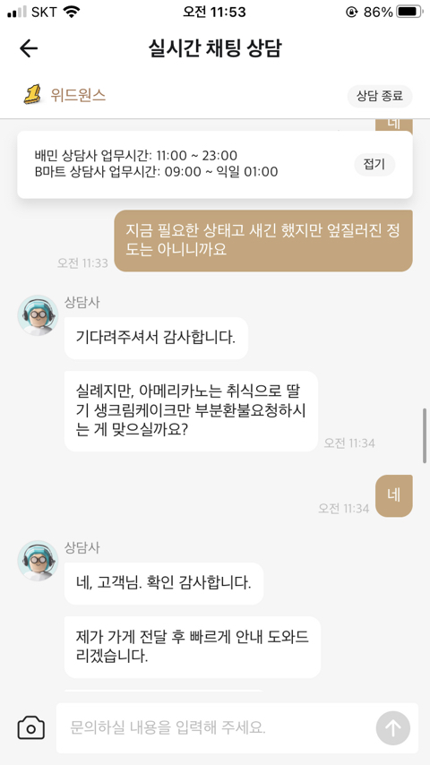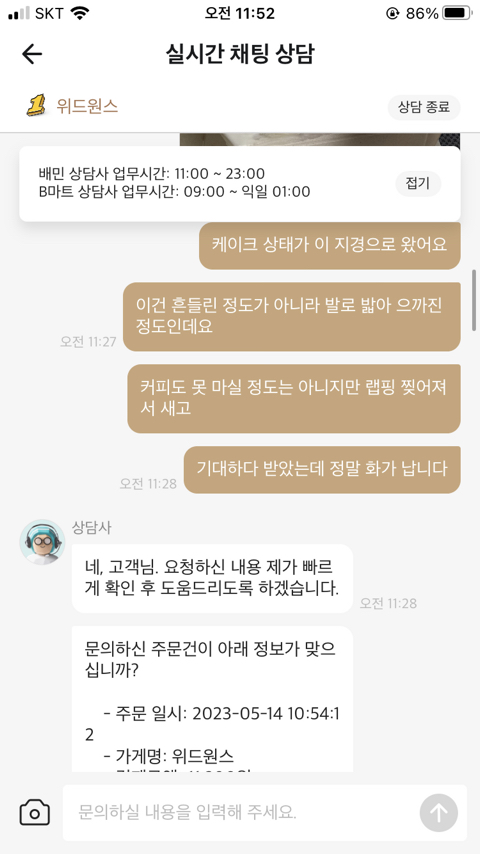 덧. 커피는 받았으니까 배달료 내는 거 아니냐는 댓이 보여서 추가 남겨. 배달 자체가 일정 금액 이상이여야 가능하고 커피만은 그 돈 주고 배달 한 게 아니잖아? 내 가 이용한 배달 서비스는 배민에서 지정한 금액 이상의 음식 전부에 대한 서비스고 그게 온전치 못했으니 환불받아야 한다는 게 내 생각이야. 배달료에 커피 몇 퍼센트, 케이크 몇 퍼센트로 할당된 게 아니니까.