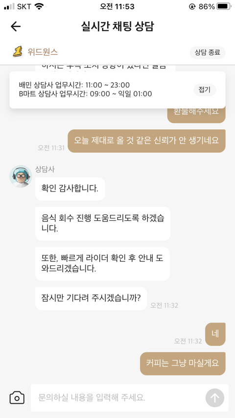 그래서 고객센터에 문의를 했어. 사실 커피도 래핑이 찢어져 좀 센 상태였는데 내가 당장 커피를 마셔야 하는 상황이라 커피를 뺀 나머지 부분의 환불을 요구했어. 배민 측에서는 업체와 연락 후 환불을 진행시켜준다고 했어. 나는 업체 측에서는 정상적으로 보낸 음식을 배달하는 과정에서 라이더가 엉망으로 배달한 거니 특히 배달료 환불을 받고 싶다고 얘기했지. 콕 찝어 배달료의 환불을 요구했을 때 나는 새로운 사실을 알게