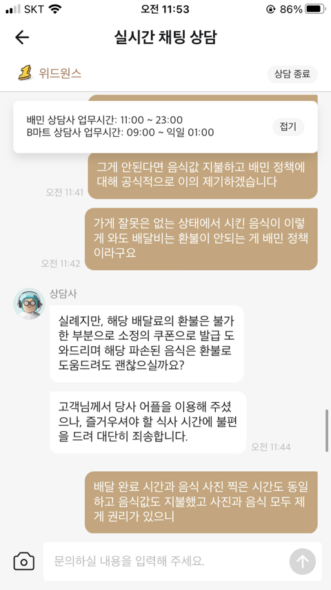 배달 실수로 음식이 정상이 아닌 상태로 배달되어도 배달료 환불을 불가능하다는 거야.