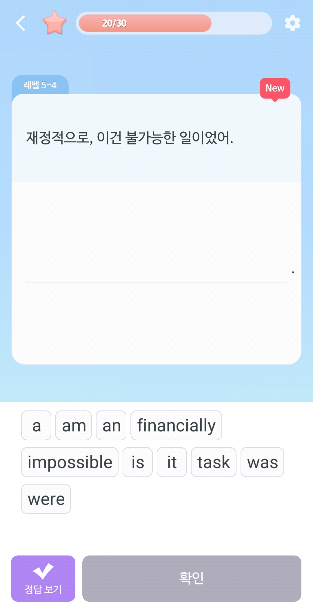 밑에 한국말을 제시해주면 밑에 단어로 문장을 만드는거야.