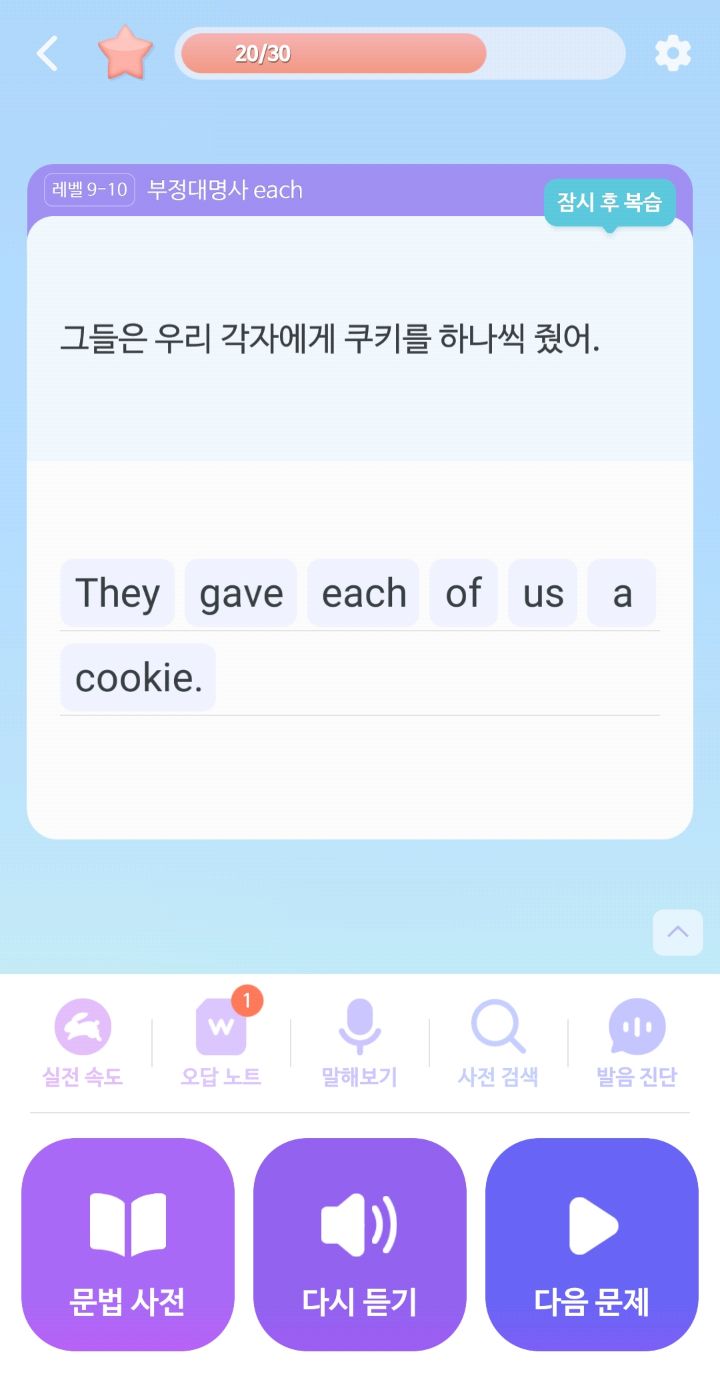 틀린 건 계속 반복해서 복습을 시켜주는 시스템이라 나중엔 안 맞을 수가 없다..ㅎㅎㅎ