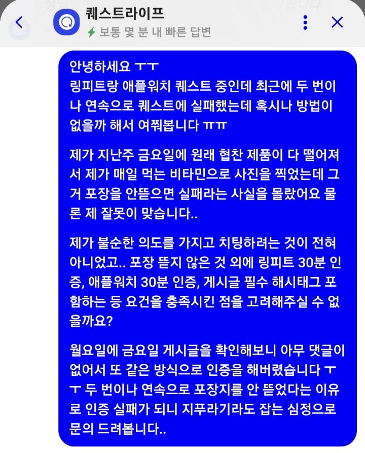 내가 이걸 접하고 주변 사람들한테도 많이 알렸고 강제로라도 운동도 하면서 갖고 싶었던 것도 살 수 있어서 좋다고 생각했어. 그런데 이런 일이 이번 한 번 뿐만이 아니야 운동도 홍보글도 열심히 다 썼는데 비타민 포장지를 안 뜯고 사진을 올렸다는 이유로 인증을 아예 안한 걸로 처리 되더라고.