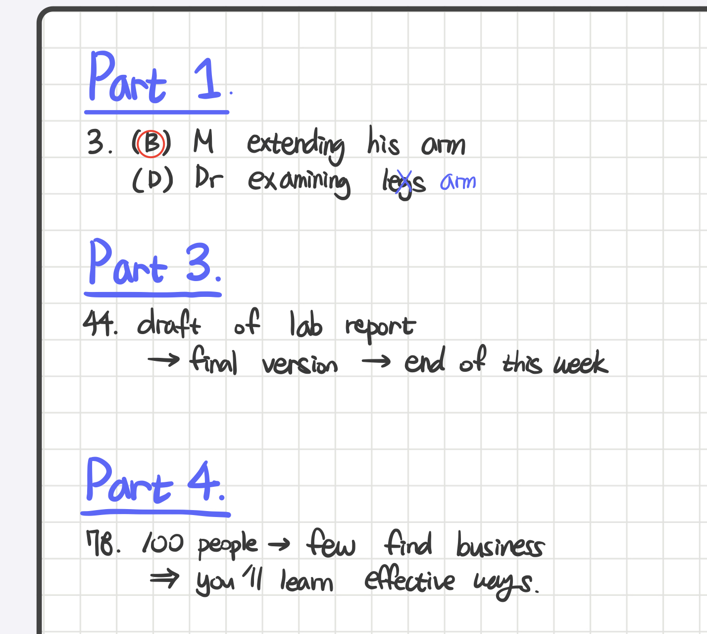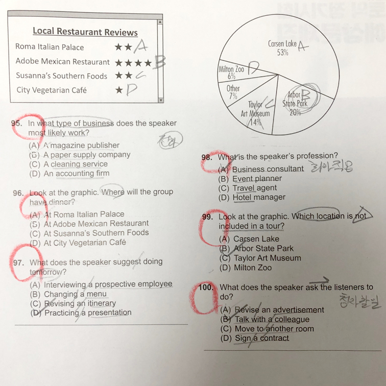 문제 훑어보고 주제는 주제라고만 써두고, 다음 화자의 행동 같은 건 will 써 놓았음. 어떤 유형의 문제인지 안 까먹으려는 나의 수작이었음. 그리고 보다시피 보기까지 다 읽어놓았음. 가령 part4는 어쩌구저쩌구하게 푸는 파트라고 영어로 읊어줄 떄, 71-73번 질문이랑 보기 다 읽어놓고, 71-73문제 시작하면 키워드만 듣고 문제를 빠르게 풀어내야함. 그래서 보기 읽을 때도 주요한 키워드만 밑줄지커나 동그라미 쳐서 읽었음. 가령 위 사진의 76번을 보면 다음 청자가 할 일(will)의 보기에서 go on a tour 다 읽는 게 아님. (A) tour (B) film (C) pt (D) meal 이런식으로 동그라미 쳐가며 짧게 읽는 거임.
