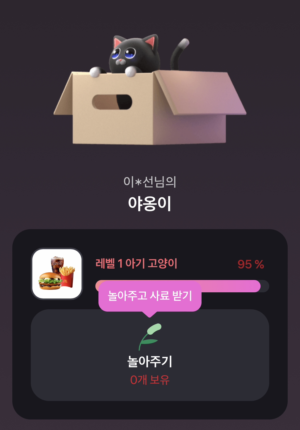 작성자나몰라아 작성시간 24.04.08 고양이를 키우고 햄버거, 커피 등의 간식을 받을 수 있어요.