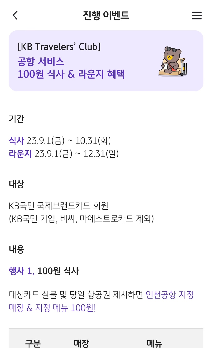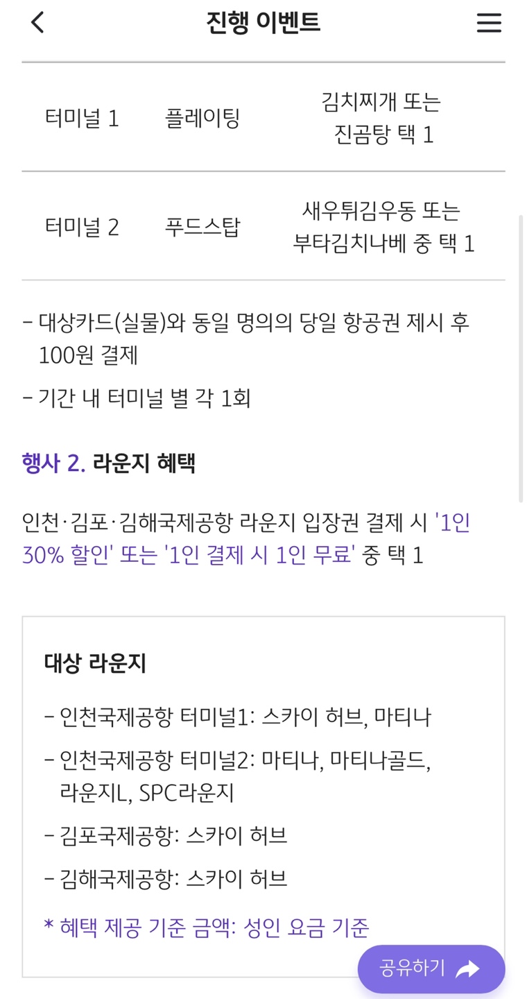 1. 인천공항 출국시 지정 식당에서 메뉴 100원 딜 & 라운지 혜택
