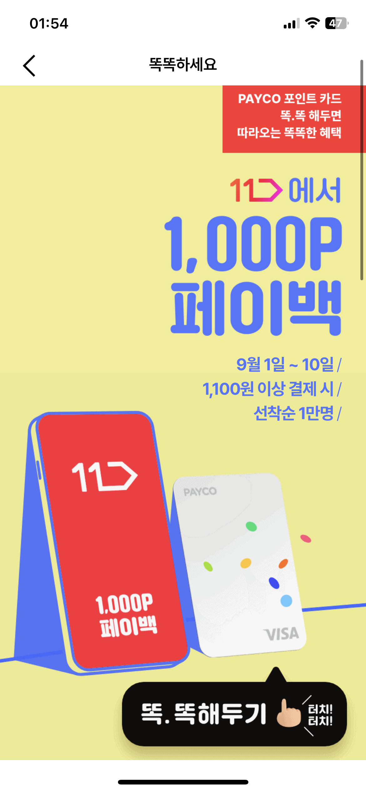[[쿠폰세일정보]]페이코 카드로 11번가 1,100원 이상 1,000P 페이백(1만명 선착순) 작성자박주미님|작성시간23.09.07|조회수2,922 목록 댓글 17 글자크기 작게가 글자크기 크게가 출처 : 여성시대 박주미님페이코 카드로1,100원 이상 쓰면 9월 26일에 1,000포인트 돌려 준대 다음검색 현재 게시글 추가 기능 열기 북마크 공유하기 신고 센터로 신고 댓글 댓글 17 댓글쓰기 답글쓰기 댓글 리스트 답댓글 작성자나으사랑개죽 | 작성시간 23.09.07 오...응모안하고 할뻔했다 ㅎㅎ 글쓴 여시두 고맙구 여시도 고마워~! 작성자닐리리리라오 | 작성시간 23.09.07 고마워 스벅 아메 하나 샀다! 작성자소형준 | 작성시간 23.09.07 고마워 메가커피 삿다 작성자Cloverrr | 작성시간 23.09.07 오 고마워 커피 샀다! 작성자런프쓰산맥 | 작성시간 23.09.08 고마워어어 댓글 전체보기