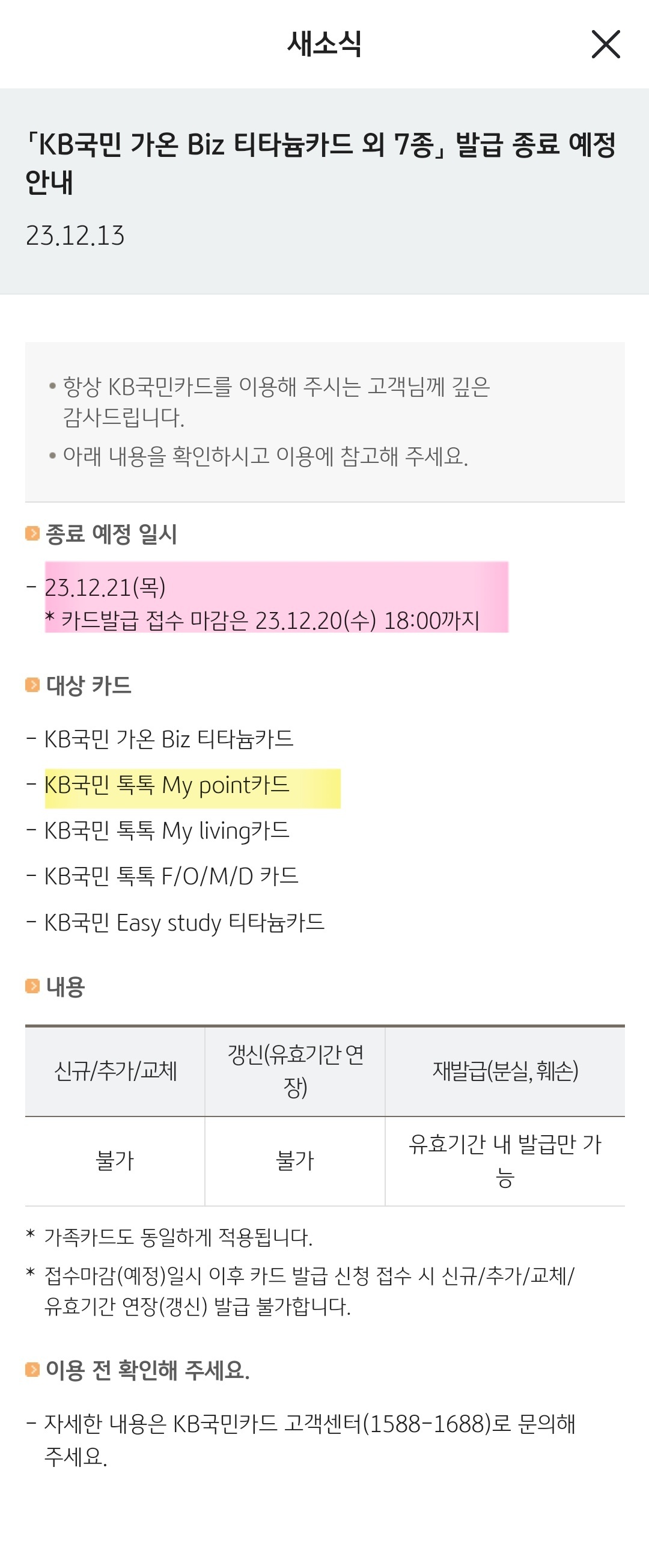 [[머니고나리]]KB 톡마포 포함 국민카드 7종 단종 예정 (재발급 접수 ~12/20 18:00) 작성자충성을 다하는 박민의 방송|작성시간23.12.13|조회수22,739 목록 댓글 229 글자크기 작게가 글자크기 크게가 출처 : 여성시대 충성을 다하는 박민의 방송KB 톡마포 사용하는 여시들 많을텐데 단종이라그래서 공지 가져옴난 공지 문자 받자마자 재발급 받아서 유효기간 2030년까지로 바꿨어~!모바일 단독이라 거의 신청하고 10분만에 교체 됨~ 다음검색 현재 게시글 추가 기능 열기 북마크 공유하기 신고 센터로 신고 댓글 댓글 229 댓글쓰기 답글쓰기 댓글 리스트 작성자오쫄티비 | 작성시간 23.12.20 아 까먹엇다 작성자초코송이조아 | 작성시간 23.12.20 헐 없어졌다...ㅠㅠㅠㅠㅠ하ㅠㅠㅠ낼 오지그랬냐..ㅠㅠㅠ흑.. 작성자대운와라 | 작성시간 23.12.21 아 해야지하면서 일하다가 존나 까먹었어.. 작성자고재고재기고 | 작성시간 24.01.06 카카오페이로 결제해도 적립 돼?? 꼭 케이비페이로 결제만 되는건가????ㅠ 답댓글 작성자충성을 다하는 박민의 방송 작성자 본인 여부 작성자 | 작성시간 24.01.09 케이비페이로만~ 댓글 전체보기