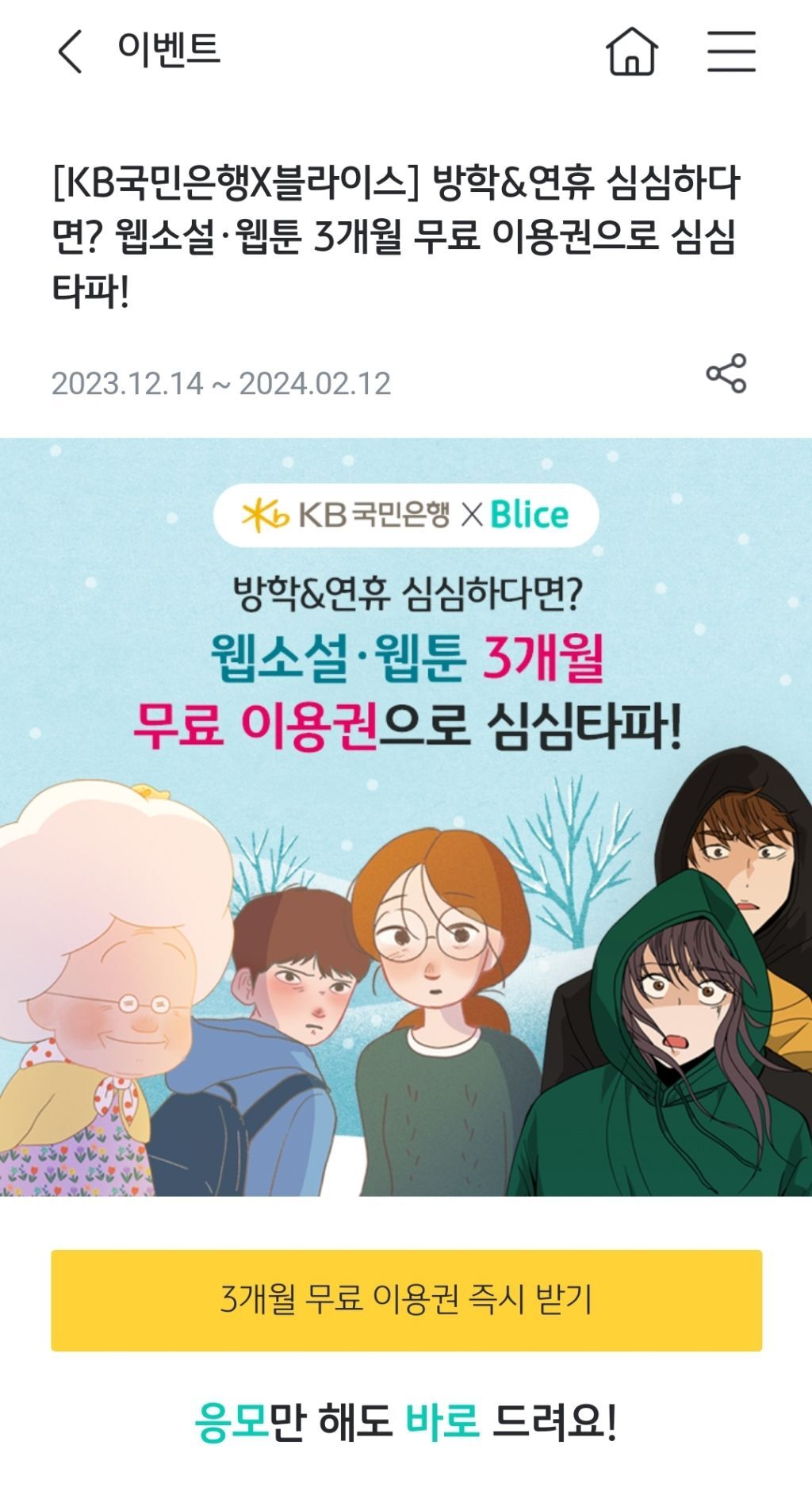 [[쿠폰세일정보]]kb국민은행 아이디 있으면 블라이스 셀렉트 3개월 무료 이용권 작성자슬프노|작성시간23.12.25|조회수5,842 목록 댓글 2 글자크기 작게가 글자크기 크게가 출처 : 여성시대 슬프노kb스타뱅킹 어플들어가서제일 하단 혜택들어가서쭉내려서 이벤트로 들어가면 있음 다음검색 현재 게시글 추가 기능 열기 북마크 공유하기 신고 센터로 신고 댓글 댓글 2 댓글쓰기 답글쓰기 댓글 리스트 작성자그린치 | 작성시간 23.12.25 고마워심심했는데.ㅎㅎ 작성자돌격해넌강해졌다 | 작성시간 23.12.25 고마워~~ 댓글 전체보기