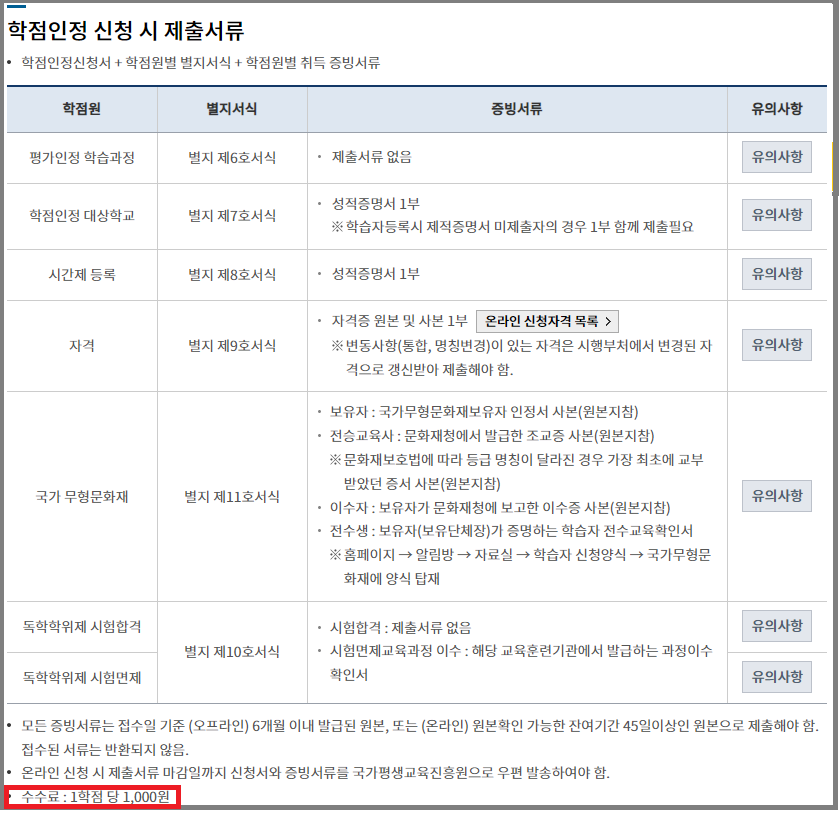 평가인정 학습과정(학점은행용 인강)과 독학사는 제출 서류가 없지만