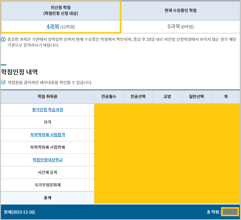 아직 학점인정신청을 하지 않은 학점을 보여줘