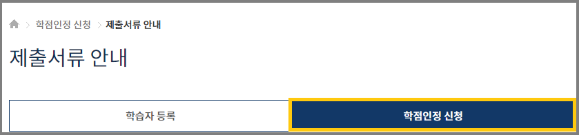 학점은행제 홈페이지 > 학점인정신청 > 제출서류 안내 > 학점인정 신청 탭