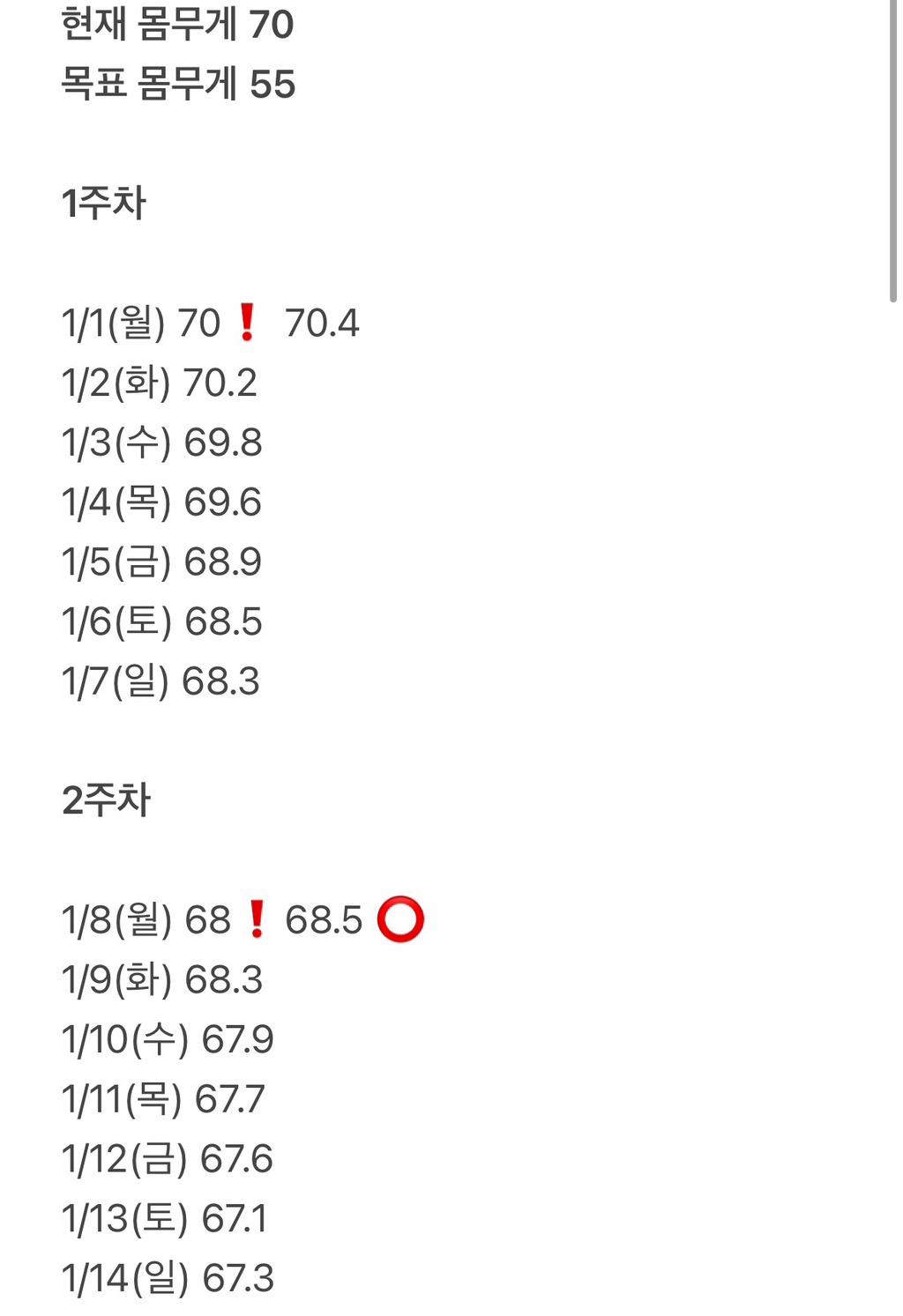 날짜와 목표 몸무게를 쭈르륵 써놓고