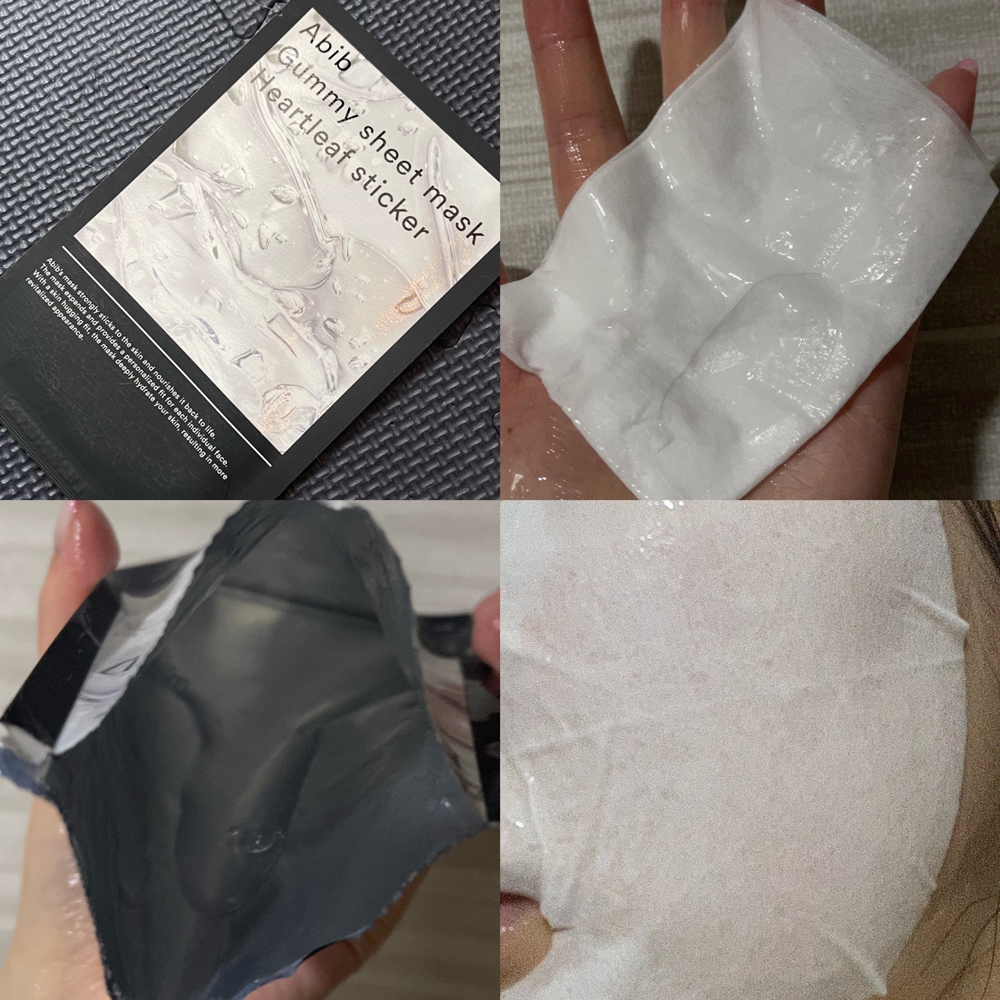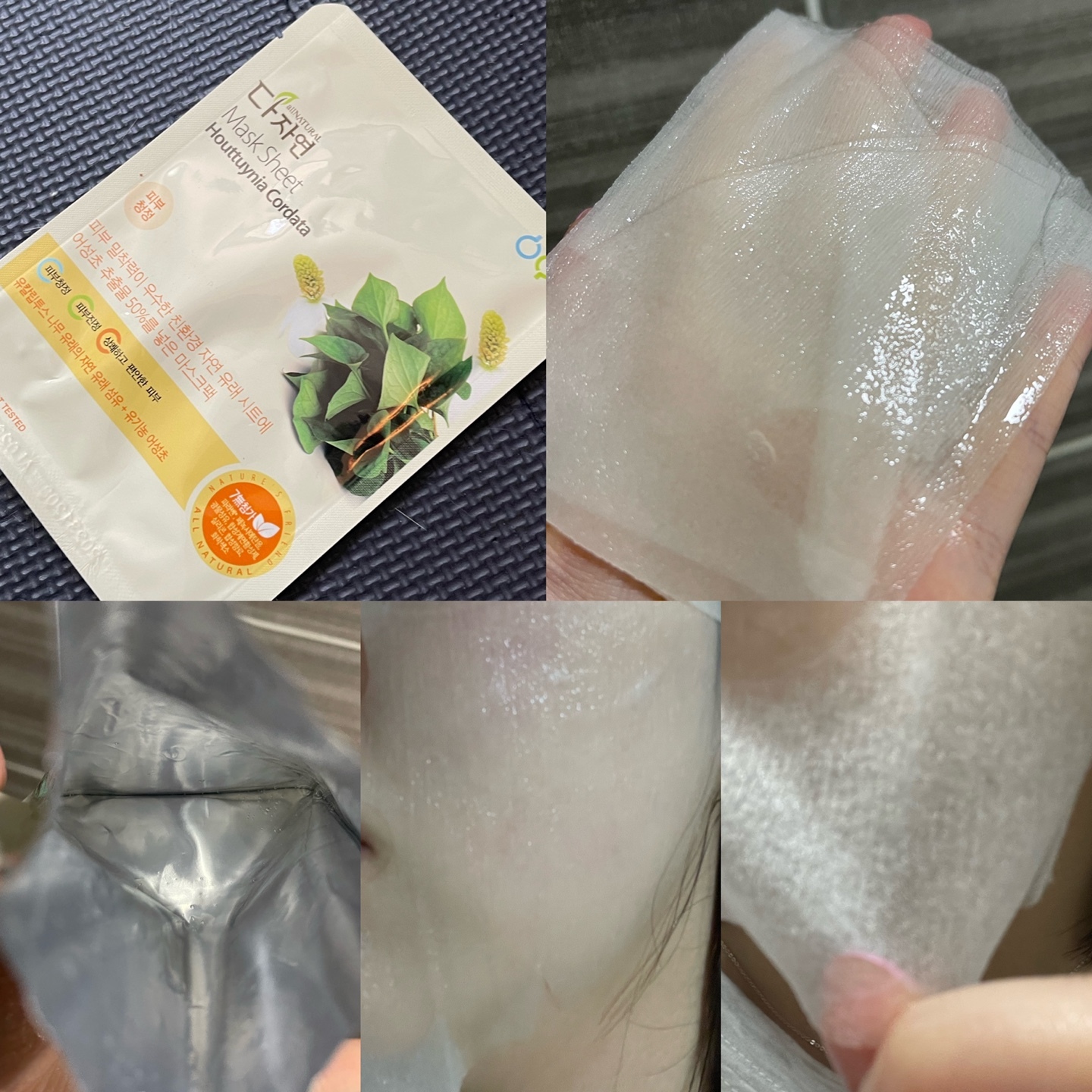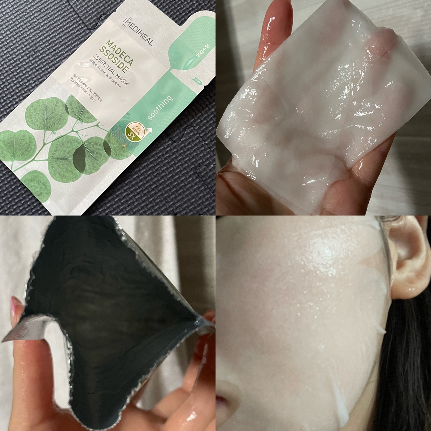 : 에센스양M / 시트지 부드러움 / 뜯을 때 신기함 모서리부터 / 에센스 살짝 화함 / 시트지 살짝 얇은 부직포느낌 / 진정효과 있음 / 무난