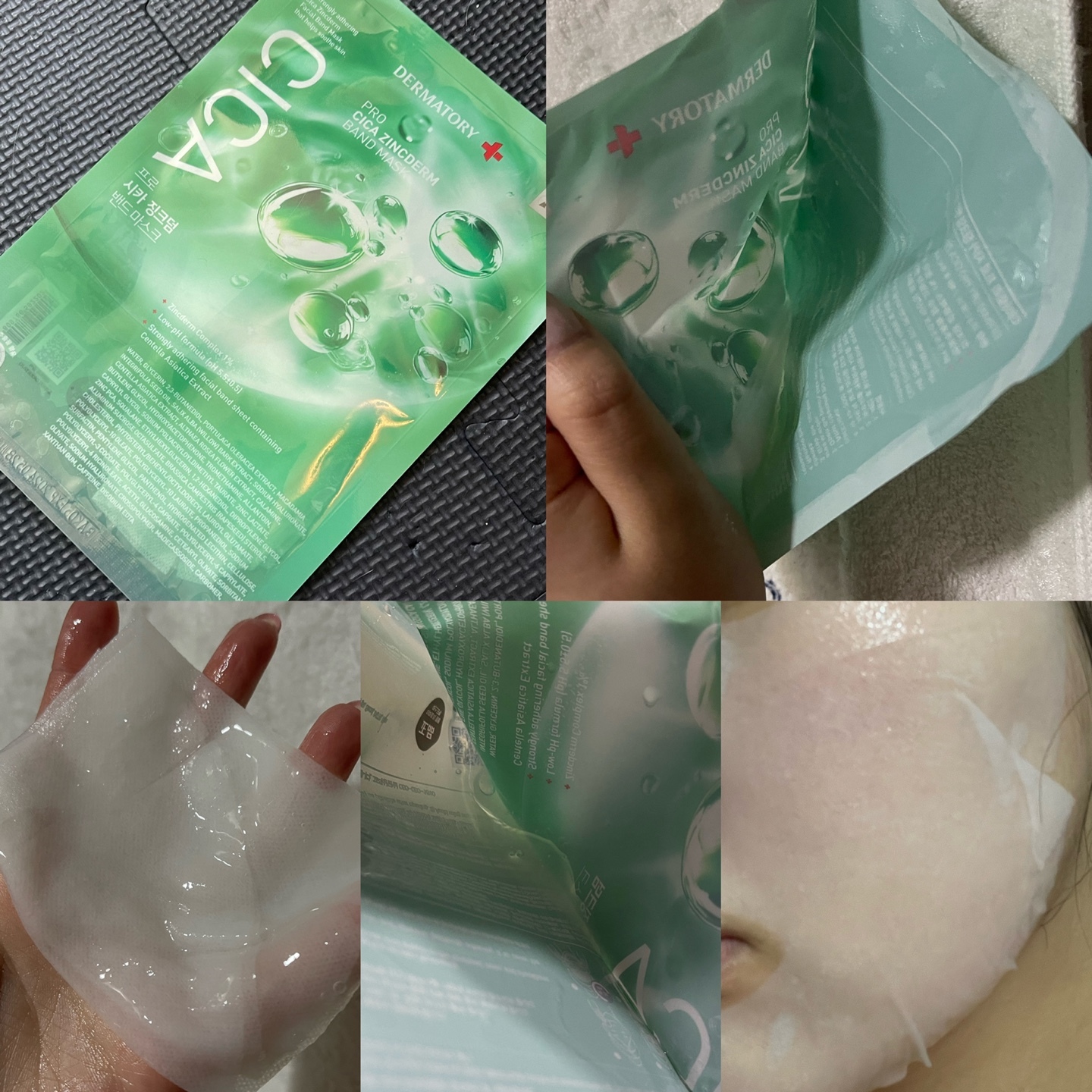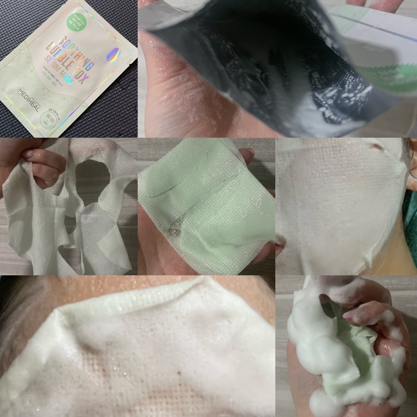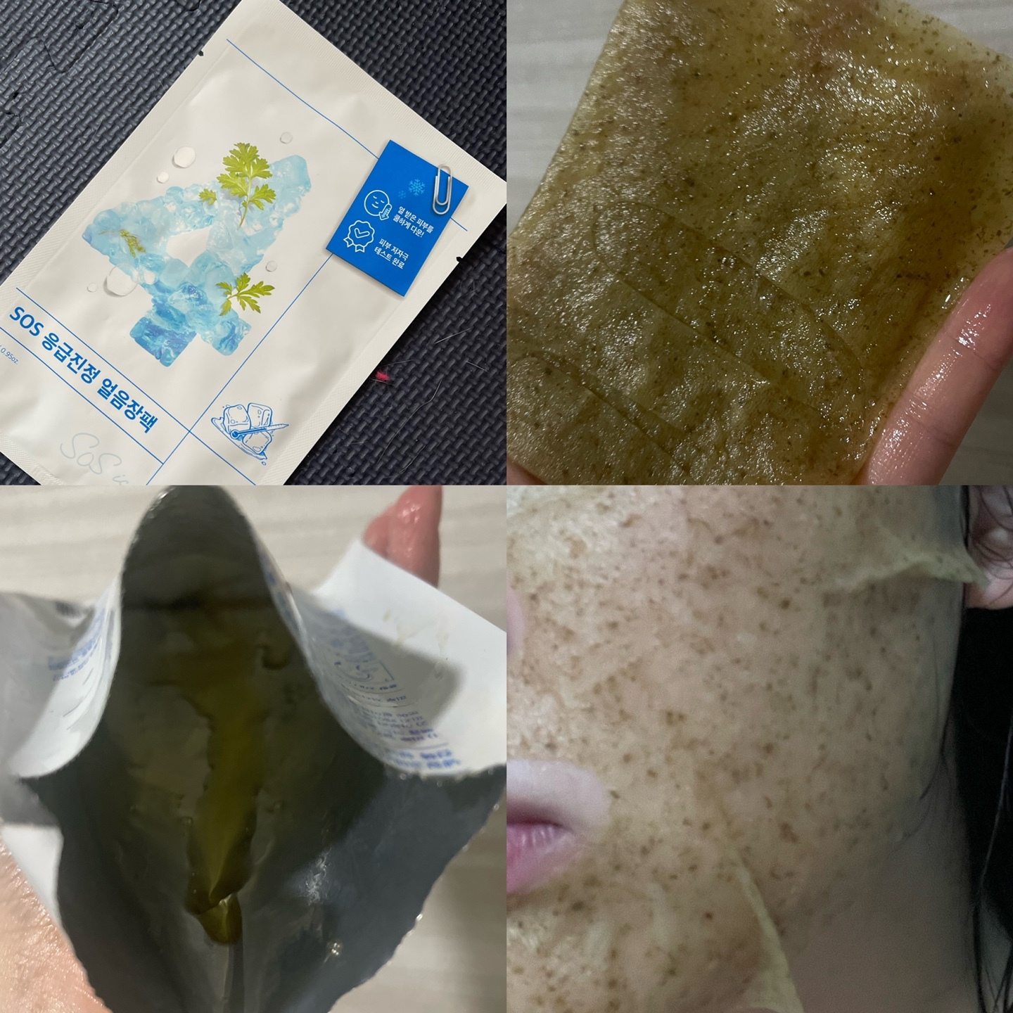 : 에센스양L / 시트지 자극적 / 구멍 송송 거즈같음 / 시트지 녹색 / 닿자마자 따가움 / 거품이 올라옴 2분만에 / 따가워서 뗌 / 바로 세수함 / 나랑 안맞음