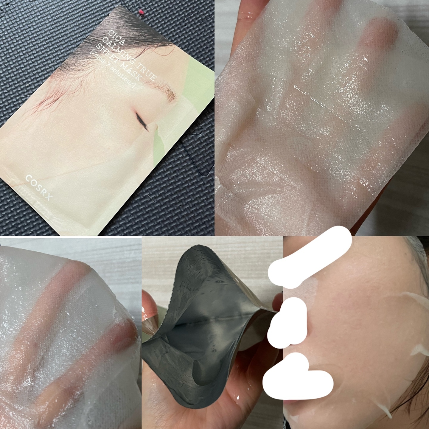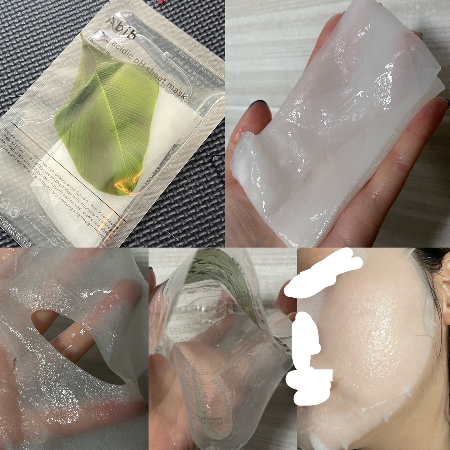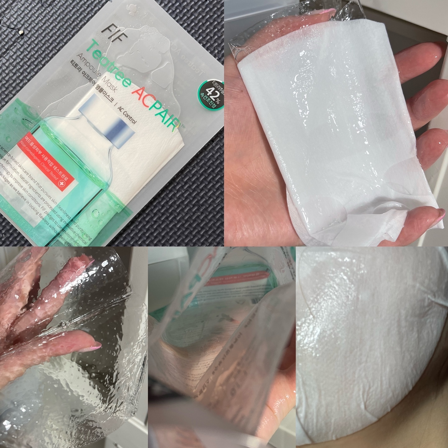: 에센스양L / 시트지 자극적 / 구멍 송송 거즈같음 / 시트지 녹색 / 닿자마자 따가움 / 거품이 올라옴 2분만에 / 따가워서 뗌 / 바로 세수함 / 나랑 안맞음