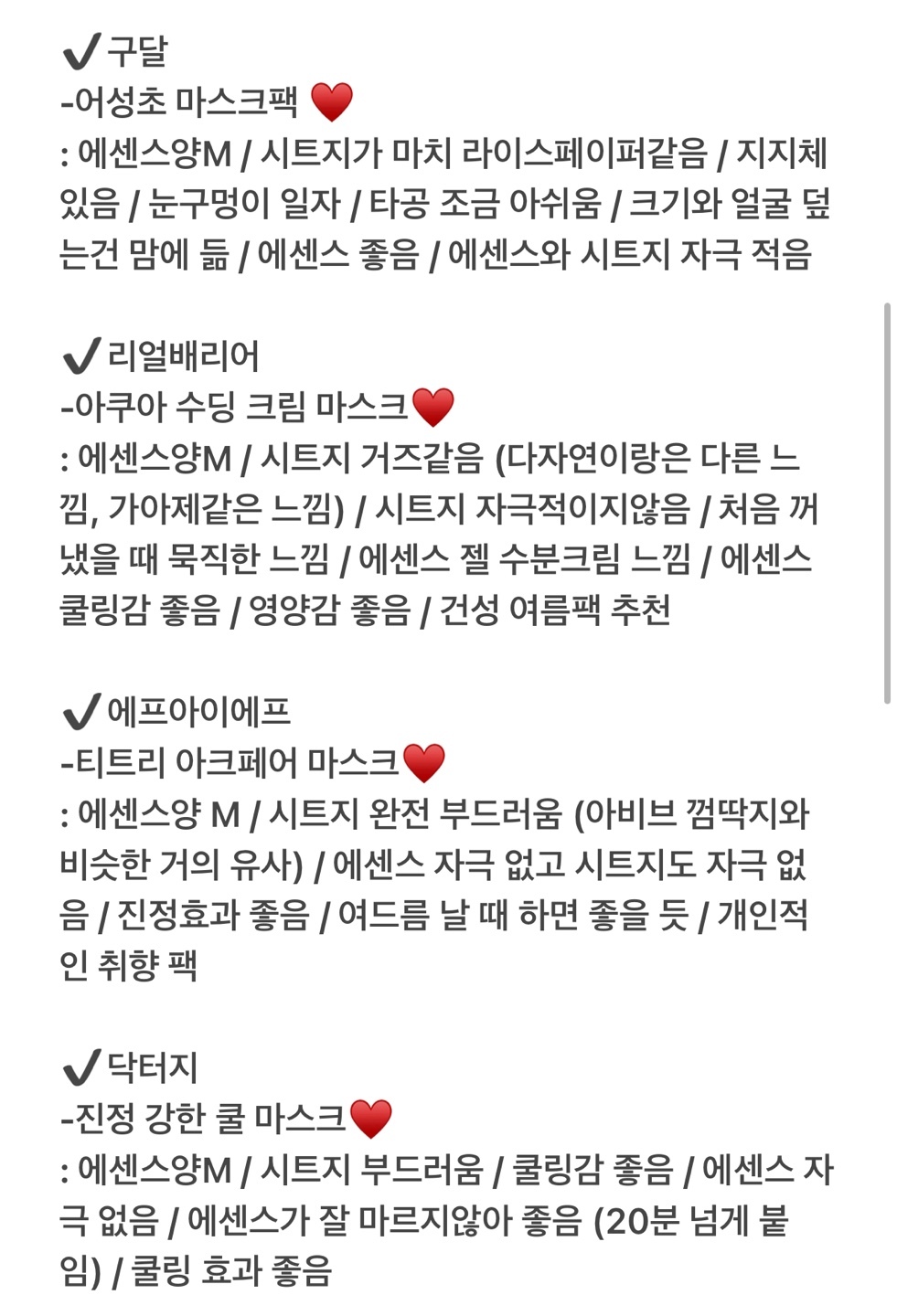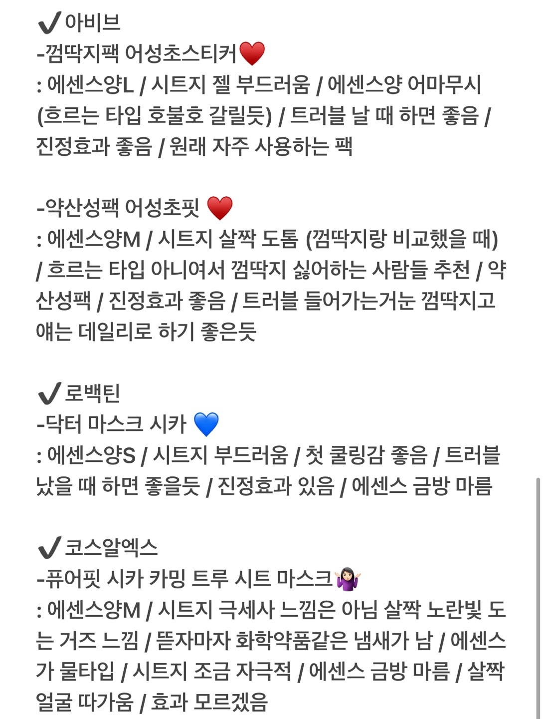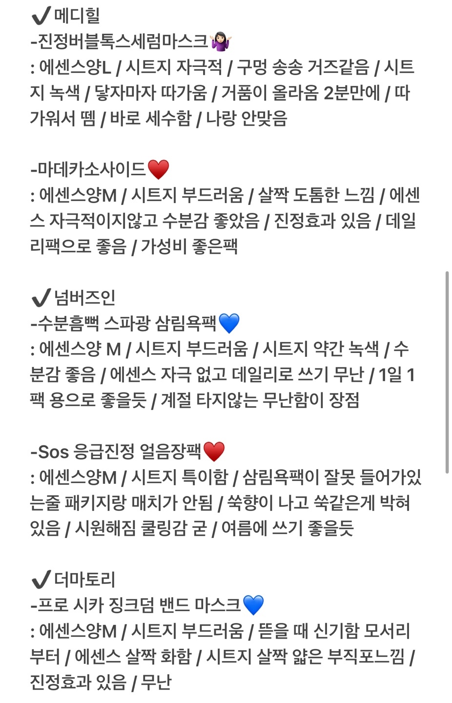 : 에센스양S / 시트지 부드러움 / 첫 쿨링감 좋음 / 트러블 났을 때 하면 좋을듯 / 진정효과 있음 / 에센스 금방 마름