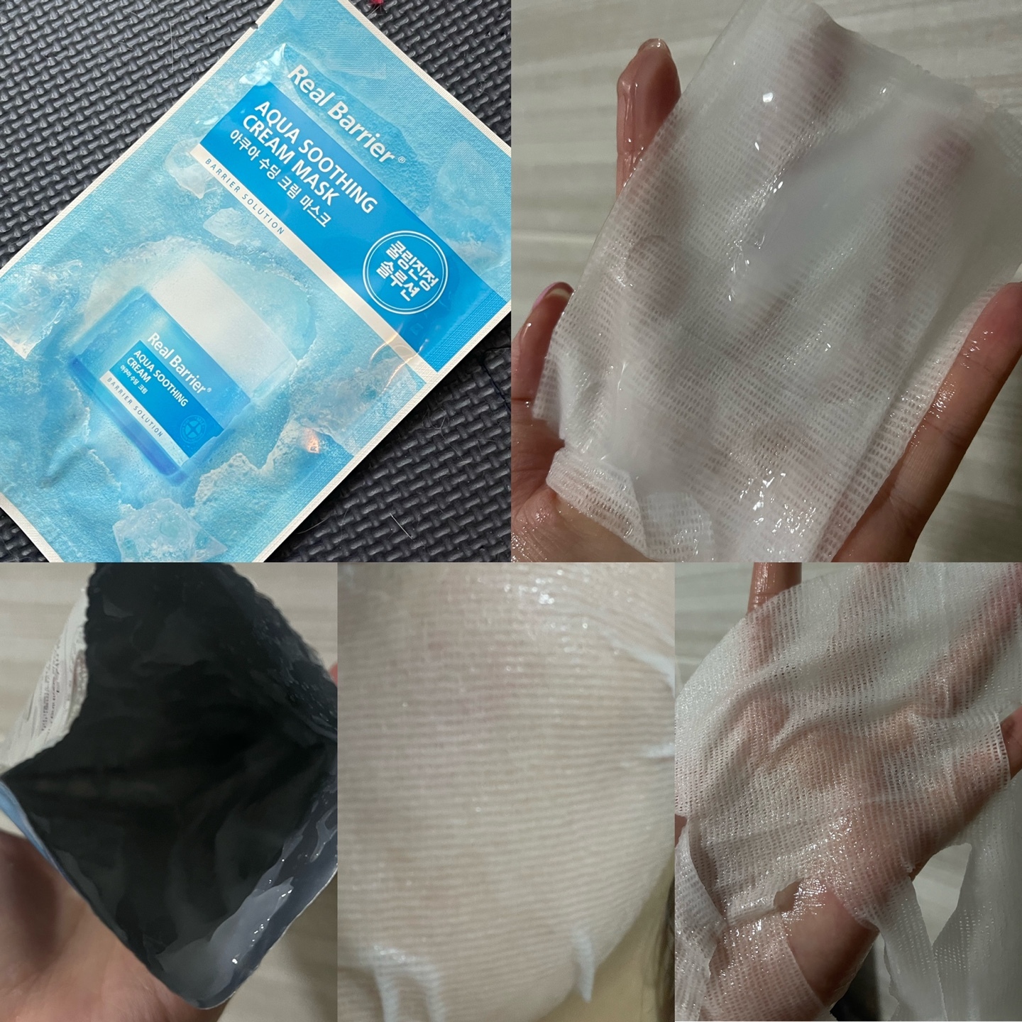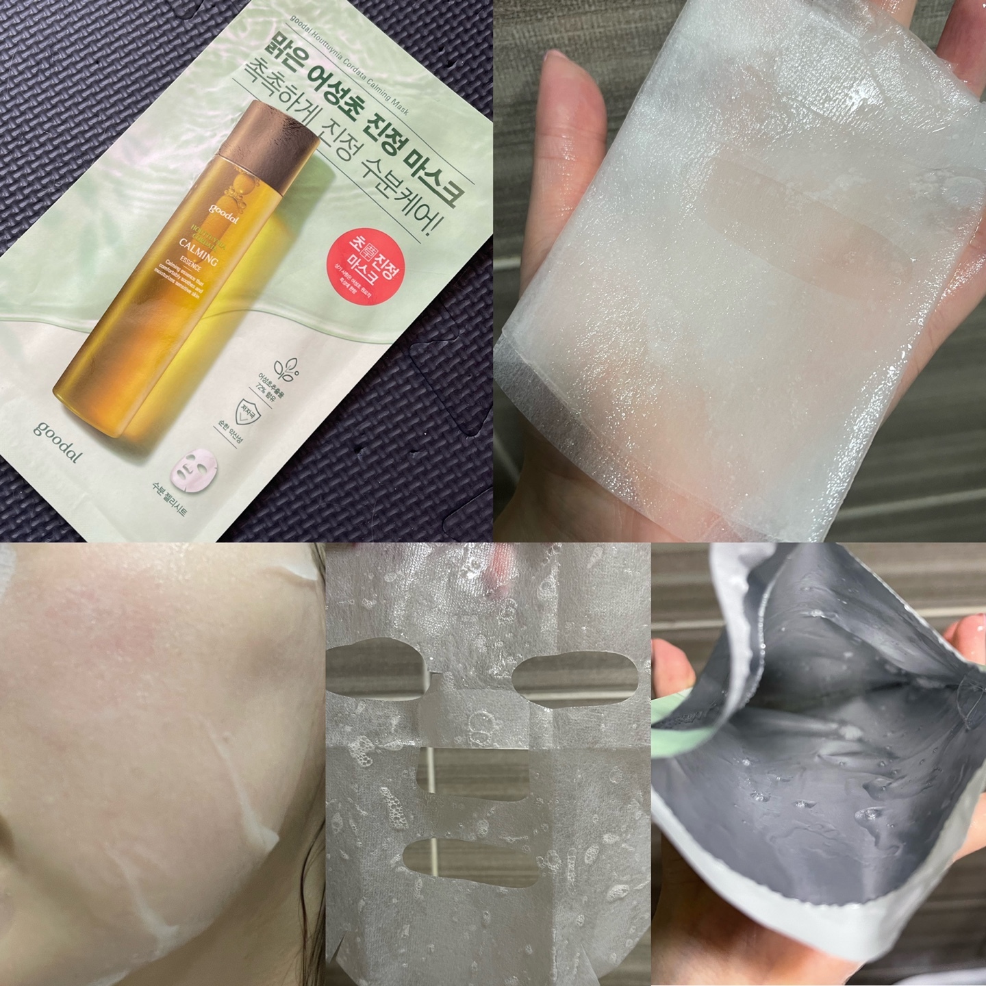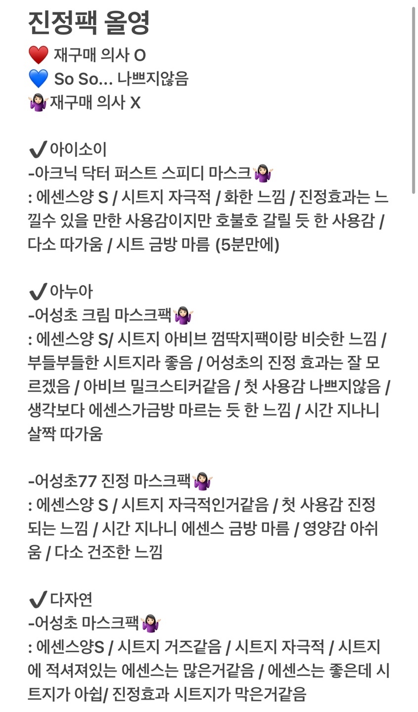 : 에센스양L / 시트지 젤 부드러움 / 에센스양 어마무시 (흐르는 타입 호불호 갈릴듯) / 트러블 날 때 하면 좋음 / 진정효과 좋음 / 원래 자주 사용하는 팩
