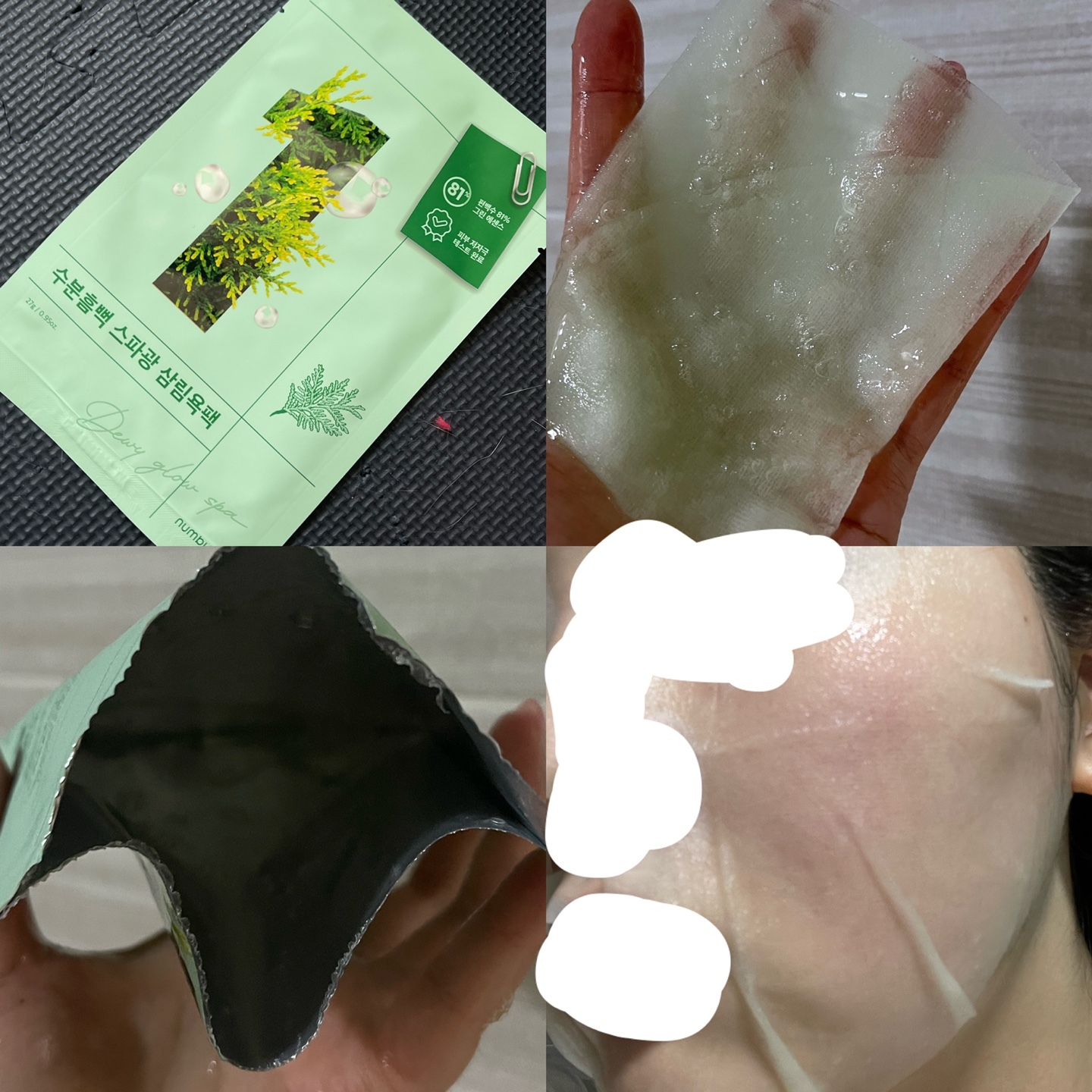 : 에센스양M / 시트지 특이함 / 삼림욕팩이 잘못 들어가있는줄 패키지랑 매치가 안됨 / 쑥향이 나고 쑥같은게 박혀있음 / 시원해짐 쿨링감 굳 / 여름에 쓰기 좋을듯