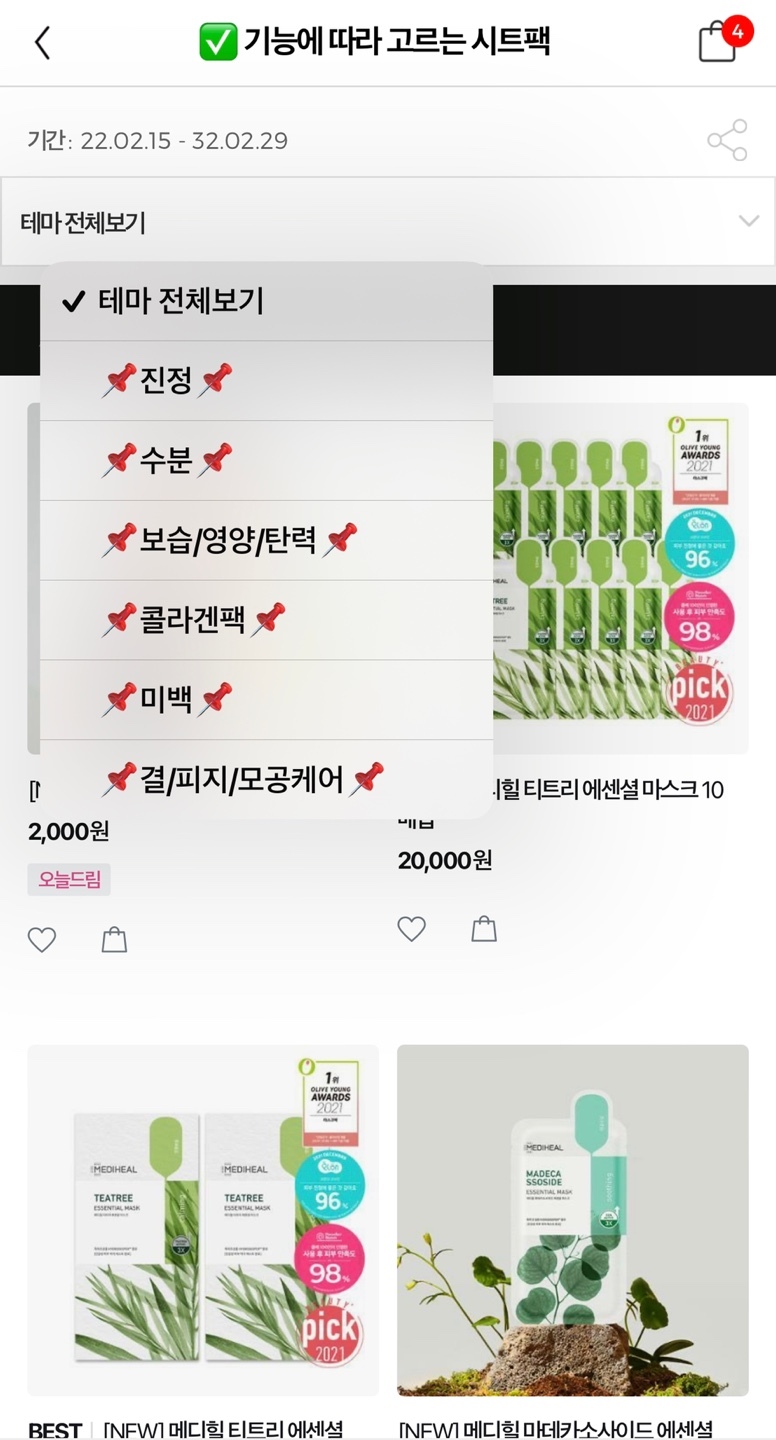 올영 앱에서 카테고리 마스크팩-시트팩 -테마전체보기-진정으로 되어있는 것들에서