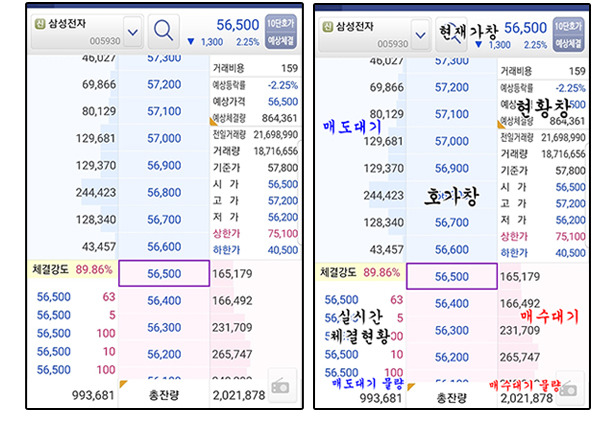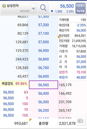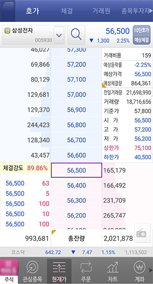 주식시장의 대표주 삼성전자의 호가창입니다.