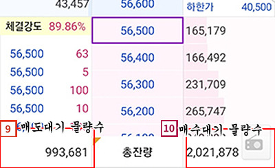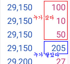 옆에 파란색 글씨로 쓴 가격대에서 주식을 팔기위해 대기중인 물량수를 보여줍니다.