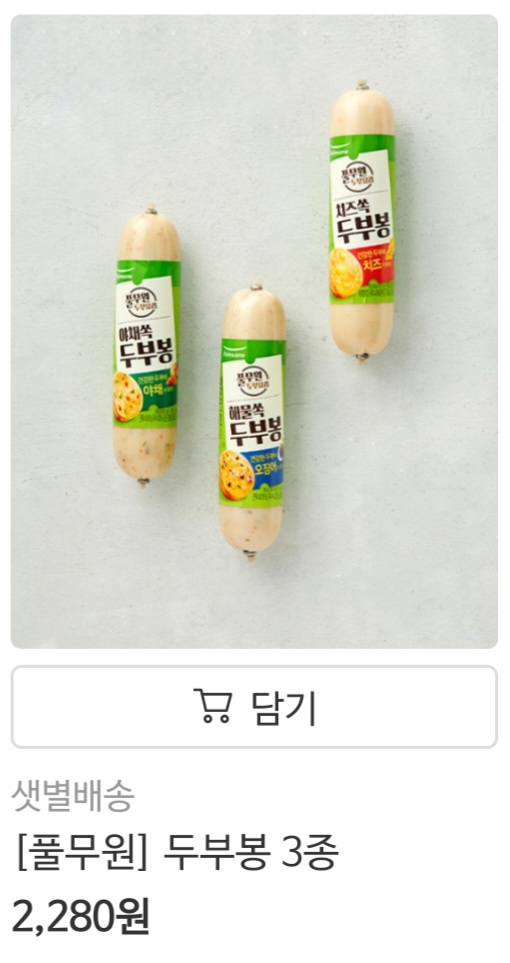 밥 반찬으로 딱임 두부봉...나는 계란물 입혀서 분홍 소세지처럼 해먹는데 그냥 살짝 굽굽해서 먹어도 좋아 간도 다 되어있고 야채 치즈 해물 이렇게 3개 있는데 나는 야채를 많이 사는편이야 ! 케찹 찍어먹기 좋음