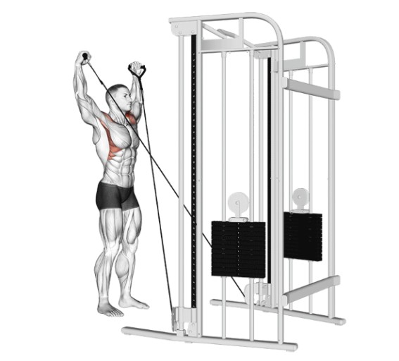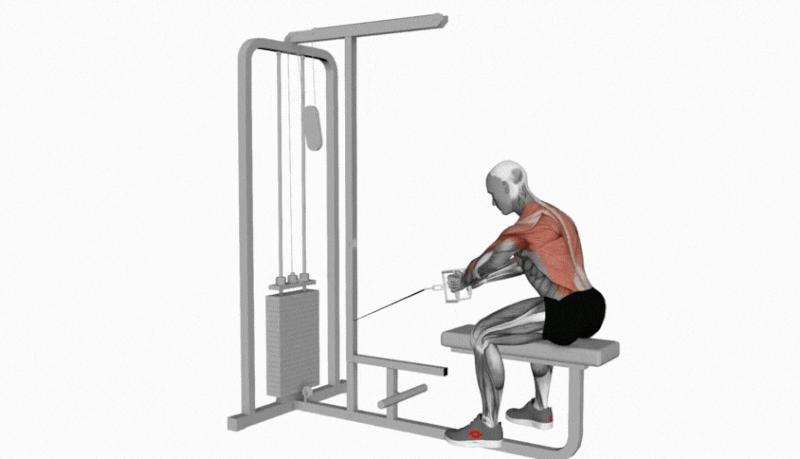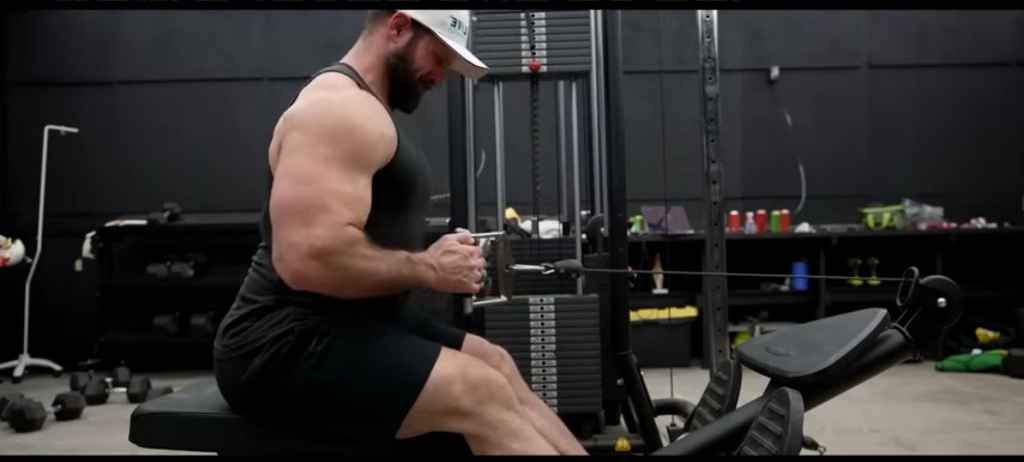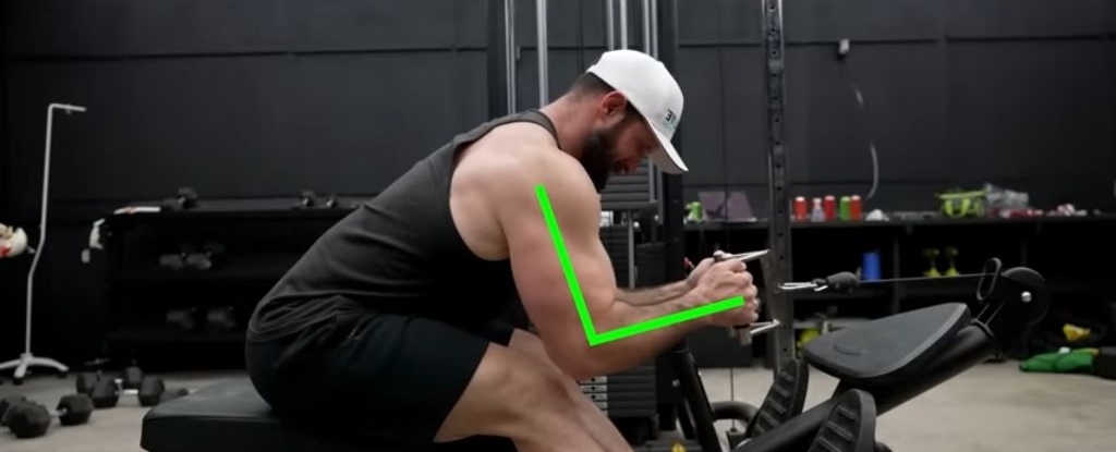 케이블 머신을 바라보며 벤치에 앉은 다음 등을 곧게 편 상태에서 언더핸드 그립으로 바를 잡는다. 이때 양팔은 완전히 뻗고 양손은 어깨너비로 벌리자.
