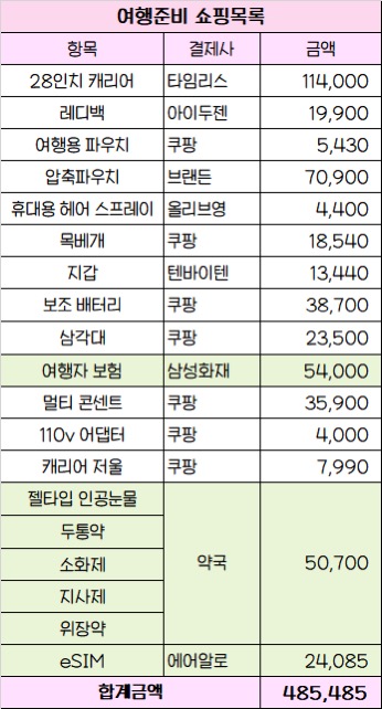 🧐 여행준비 쇼핑목록 총 485,485