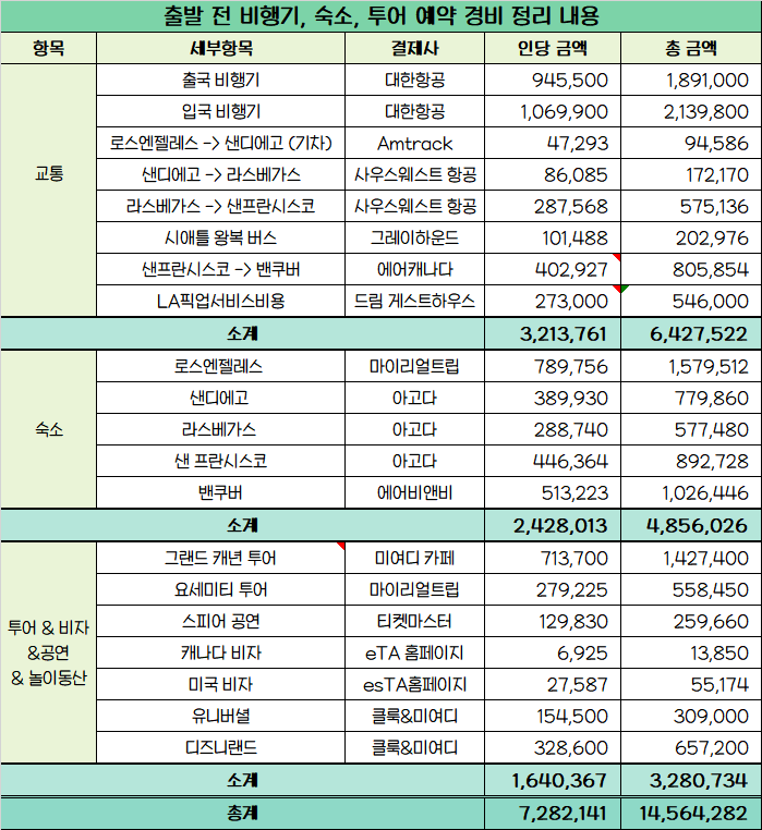 🧐 출발 전 준비비용 1인당 총 7,282,141원