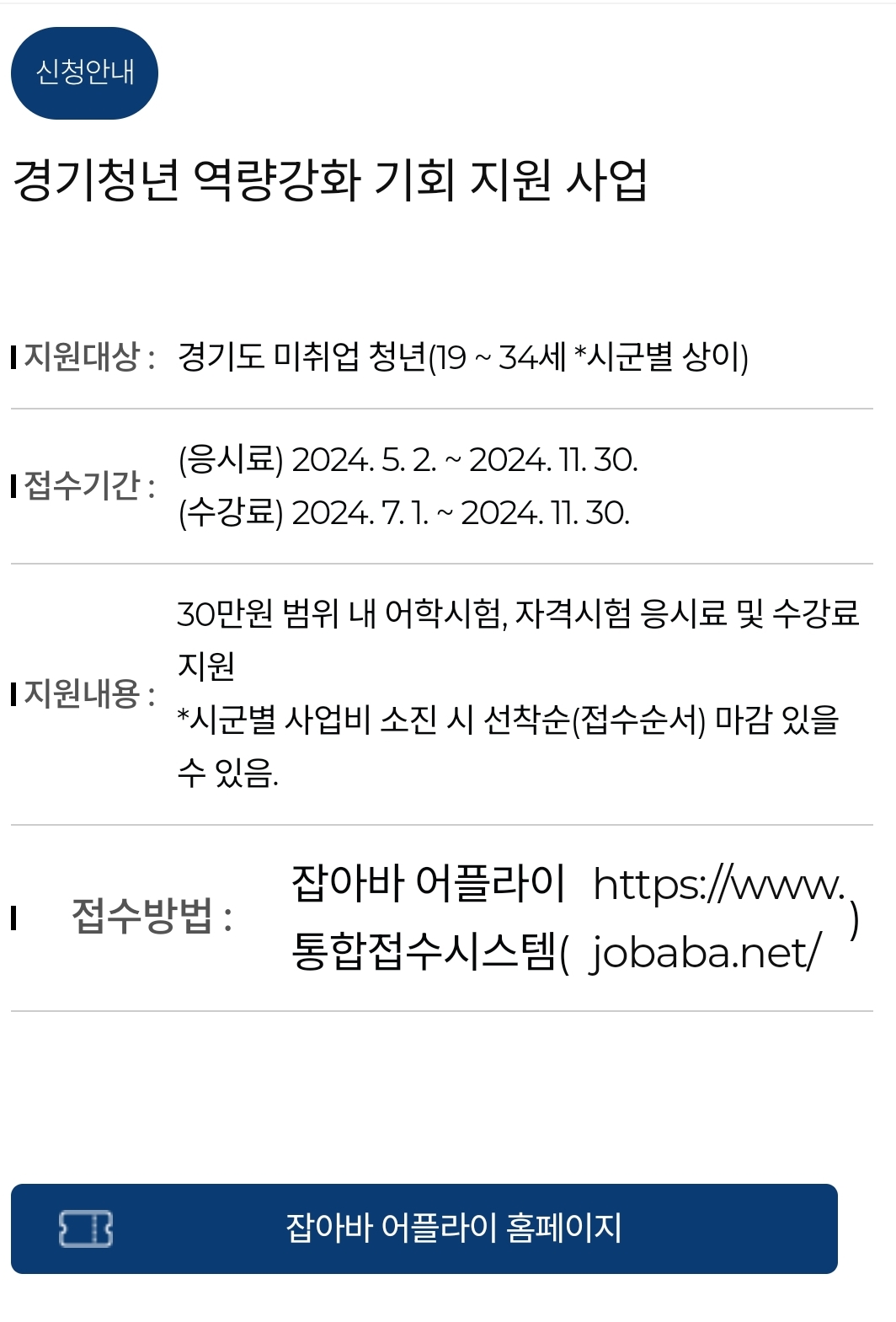 [생활정보]경기도 백수 여시들 토익 등 어학시험이랑 자격증 응시료랑 학원 수강료 지원받아! 작성자다합돈|작성시간24.05.15|조회수10,472 목록 댓글 27 글자크기 작게가 글자크기 크게가 출처 : 여성시대 다합돈, https://youth.gg.go.kr/경기청년포털여기를 눌러 링크를 확인하세요youth.gg.go.krhttps://apply.jobaba.net/경기도 일자리재단 공통 시스템여기를 눌러 링크를 확인하세요apply.jobaba.net미취업 청년들 30만원까지 지원해준대 응시료 뿐만이 아니라 수강료도 가능해!자세한 사항은 위의 링크에서 찾아봐줘~ 다음검색 현재 게시글 추가 기능 열기 북마크 공유하기 신고 센터로 신고 댓글 댓글 27 댓글쓰기 답글쓰기 댓글 리스트 작성자큰거기다리는중 | 작성시간 24.05.16 인프런 인강은 안되겠지 작성자음냠냠얌냠 | 작성시간 24.05.16 와 진짜 고마워!! 사촌언니 보내줬어😍 작성자돈터치돈터치 | 작성시간 24.05.17 넘 고마워~~~~ 작성자이요25 | 작성시간 24.05.18 떨어져도 주나 ㅜㅜ 작성자익키 | 작성시간 24.05.19 오쓋 ㅜ1-4월에 햇는데…. 점수 더 올료야겟다오 이미 본것도 된다~~ 댓글 전체보기