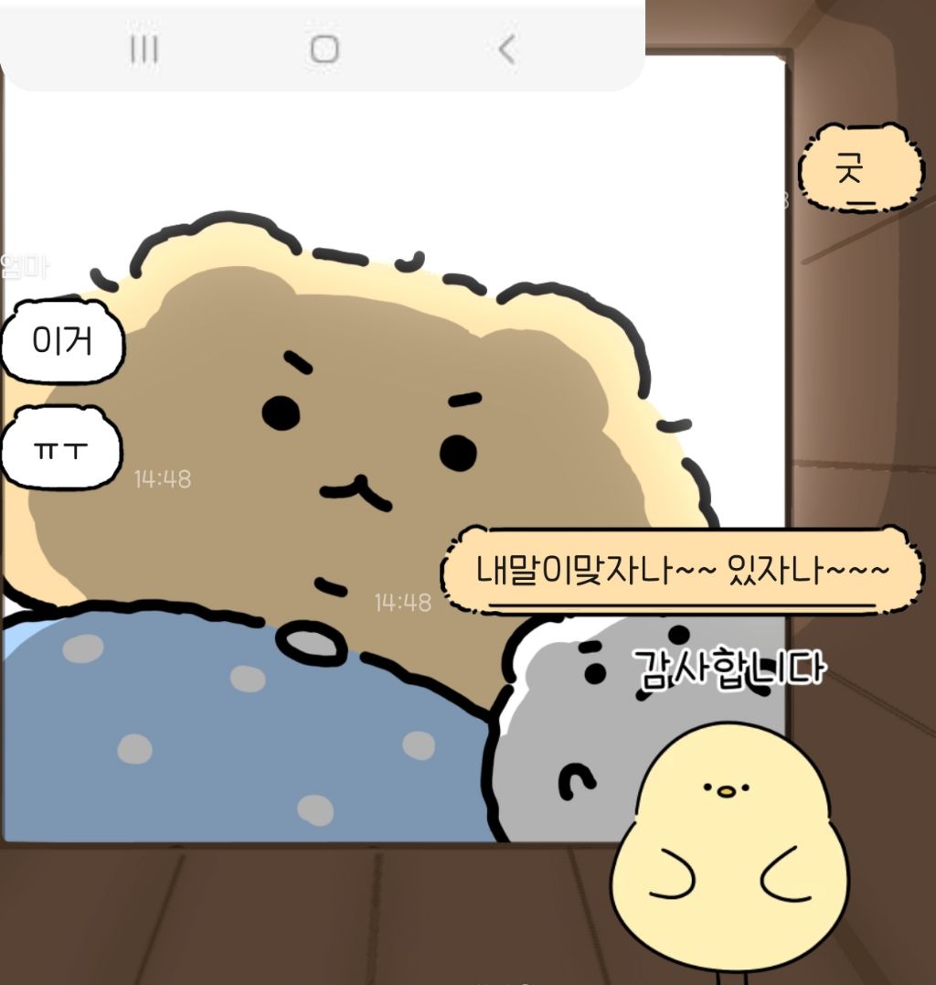 이제 제일 밑에 있는 네모난 홈버튼을 눌러 화면으로 나가게 아바타를 아 아니 엄마를 조종합니다.