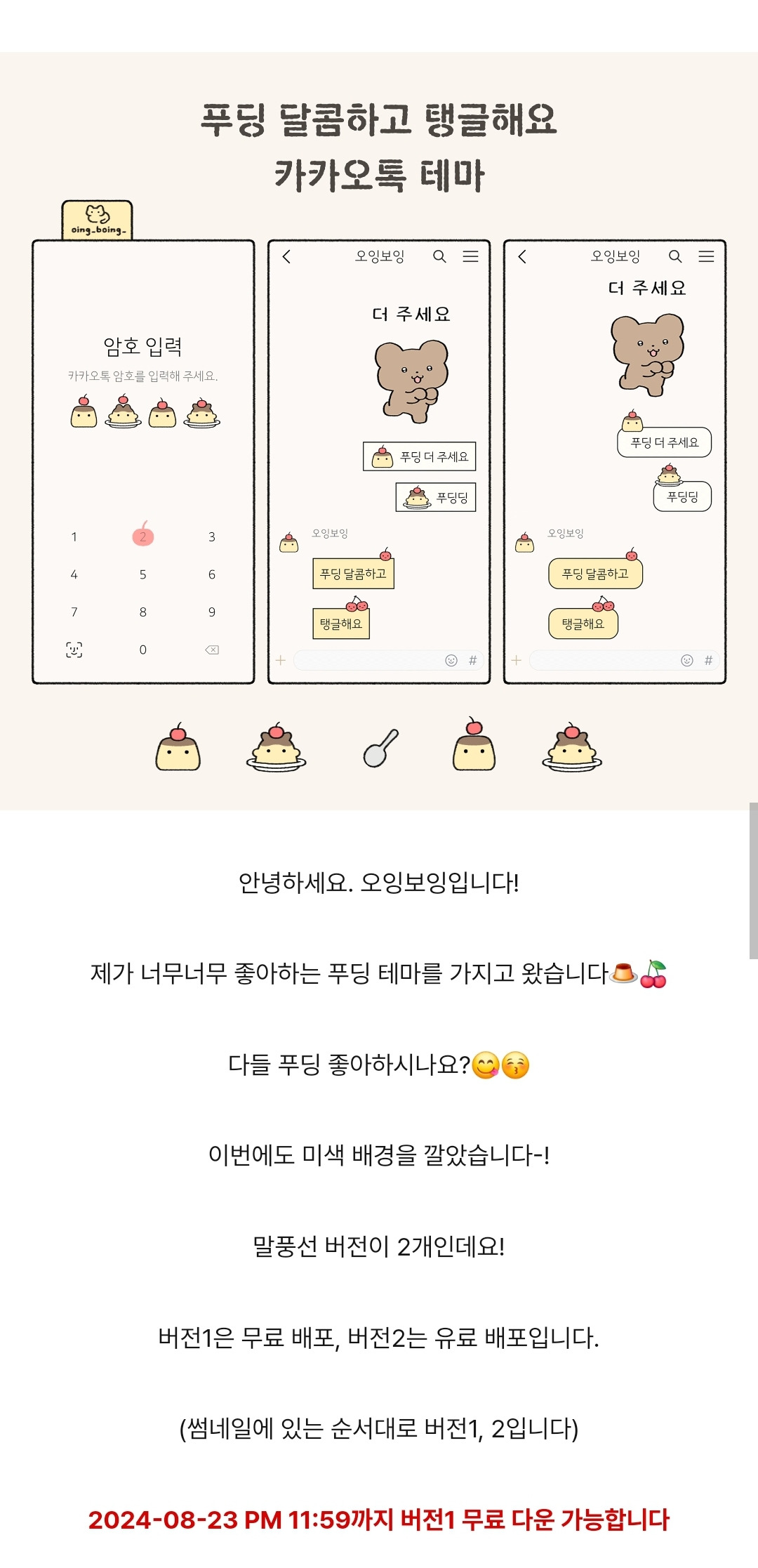 [스크랩] [폰꾸미기]오잉보잉님 푸딩 달콤하고 탱글해요 카톡 테마(IOS&AND) 작성자은조|작성시간24.08.23|조회수19,880 목록 댓글 11 글자크기 작게가 글자크기 크게가 https://www.postype.com/@oingboing/post/17452856푸딩 달콤하고 탱글해요 카톡 테마[ios&and]: 오잉보잉*구매 전 하단에 있는 공지사항 및 오류 해결법을 꼭 읽어보시길 바랍니다* 공지사항을 읽지 않아 발생한 문제는 제가 책임지지 않습니다. 안녕하세요. 오잉보잉입니다! 제가 너무너무 좋아하는www.postype.com 내일 23시 59분까지 버전1 무료다운 가능하다잔아 다음검색 스크랩 원문 : 밀리토리네 현재 게시글 추가 기능 열기 북마크 공유하기 신고 센터로 신고 댓글 댓글 11 댓글쓰기 답글쓰기 댓글 리스트 작성자찹쌀토끼 | 작성시간 24.08.23 귀여워 고마워💕💕 작성자헤이Heyyy | 작성시간 24.08.23 우와 ㄱㅇㅇ 규마워 작성자짱이 될 거야 | 작성시간 24.08.23 짱귀엽다 망곰이 쓰는데 갈아탈 때가 되었군 작성자야채타임케찹맛 | 작성시간 24.08.23 개기여워 깔앗어 고마워 작성자넘추워요 | 작성시간 24.08.24 유료구나 ㅜㅜ 흑 댓글 전체보기